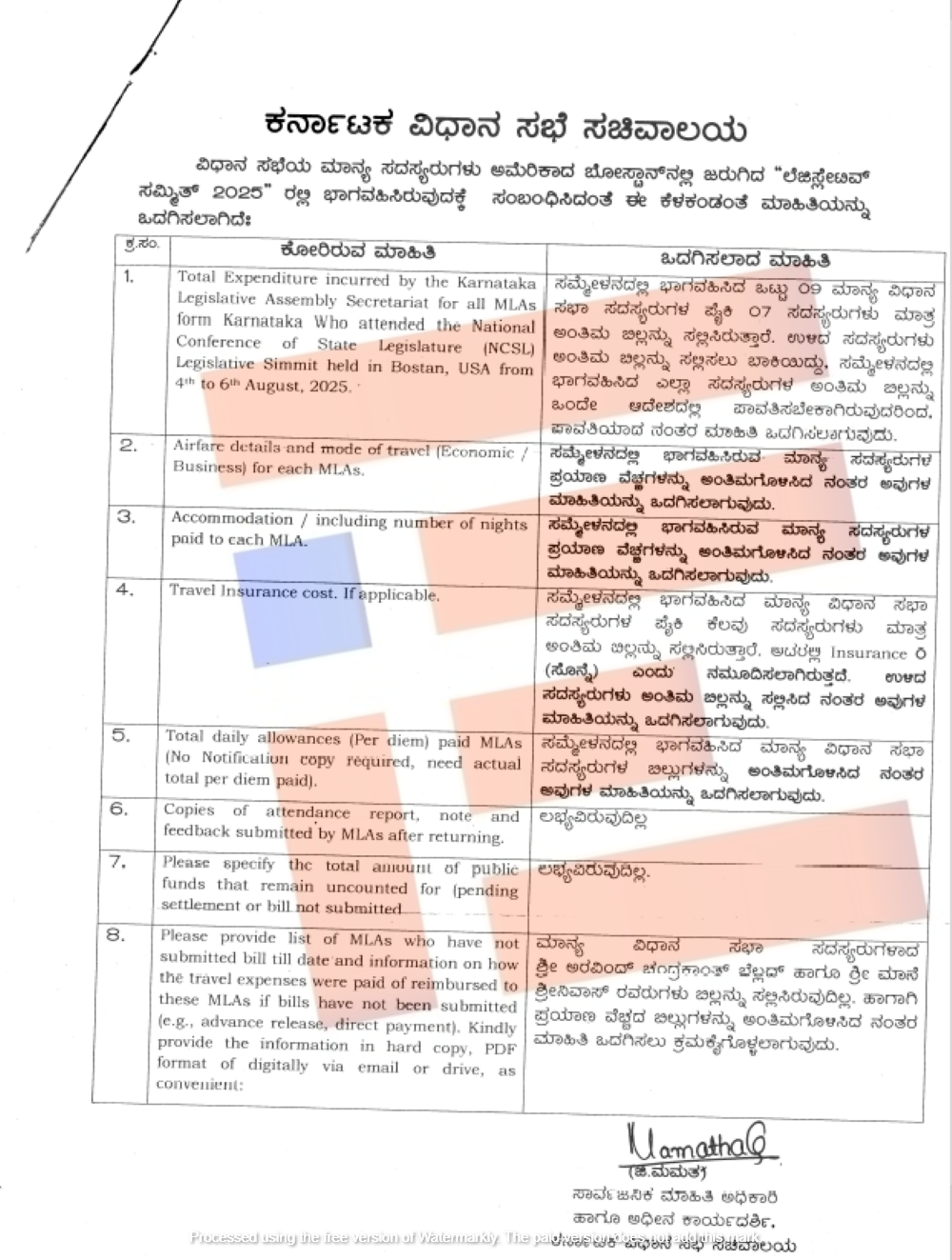 ಉಳಿದಂತೆ ಕರ್ನಾಟಕ ವಿಧಾನ ಸಭೆ ಸಚಿವಾಲಯವೇ ಇತರೆ ವೆಚ್ಚ ಭರಿಸಿದೆ. ಸಮ್ಮೇಳನದಲ್ಲಿ ಭಾಗವಹಿಸಿದ ಹಾಜರಾತಿ, ವರದಿಗಳು, ಪ್ರತಿಕ್ರಿಯೆಗಳು ಇತರೆ ಎಲ್ಲವನ್ನೂ ಅಂತಿಮ ಬಿಲ್ನಲ್ಲಿ ಸಲ್ಲಿಸಲಿದ್ದಾರೆ ಎಂದು ಮಾಹಿತಿ ಒದಗಿಸಿದ್ದರು. ದಿನಭತ್ಯೆ ಪಾವತಿ ಕುರಿತು 2011ರ ನವೆಂಬರ್ 17ರಂದೇ ಆರ್ಥಿಕ ಇಲಾಖೆಯು ಸುತ್ತೋಲೆ ಹೊರಡಿಸಿದೆ. ಆದರೂ ಈ ಸುತ್ತೋಲೆ ಪ್ರಕಾರ ಶಾಸಕರು ವಾಸ್ತವ ವೆಚ್ಚಗಳನ್ನು ಒದಗಿಸಬೇಕಿತ್ತು. ಆದರೆ ಐದಾರು ತಿಂಗಳಾದರೂ ಸಹ ಯಾವುದೇ ಮಾಹಿತಿ ಒದಗಿಸಿಲ್ಲ. ಅಲ್ಲದೆ ಮುಂಗಡ ಪಾವತಿ ಸಂಬಂಧ ಯಾವುದೇ ಕರ್ನಾಟಕ ವಿಧಾನಸಭೆ ಸಚಿವಾಲಯವು ಮಾಹಿತಿ ನೀಡಿಲ್ಲ.
