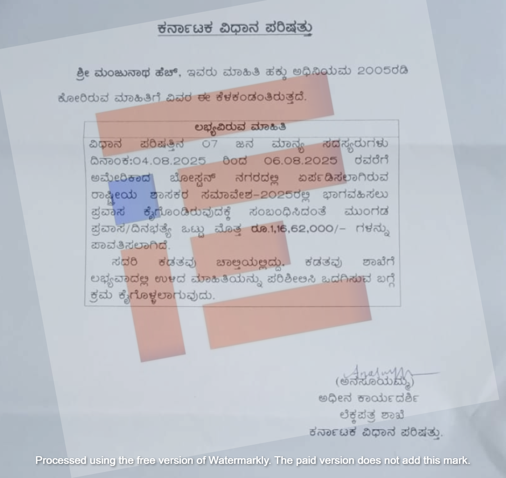 ಪರಿಷತ್ ಸಚಿವಾಲಯವು ಸಹ 2025ರ ಡಿಸೆಂಬರ್ 10ರಂದು ನೀಡಿದ್ದ ಮಾಹಿತಿ ಪ್ರಕಾರ “ವಿಧಾನ ಪರಿಷತ್ತಿನ 07 ಜನ ಸದಸ್ಯರುಗಳು ಪ್ರವಾಸ ಕೈಗೊಂಡಿರುವುದಕ್ಕೆ ಸಂಬಂಧಿಸಿದಂತೆ ಮುಂಗಡ ಪ್ರವಾಸ/ದಿನಭತ್ಯೆ ಒಟ್ಟು ಮೊತ್ತ 1,16,62000/- ಗಳನ್ನು ಪಾವತಿಸಲಾಗಿದೆ,’ ಎಂದು ಮಾಹಿತಿ ಒದಗಿಸಿದೆ.