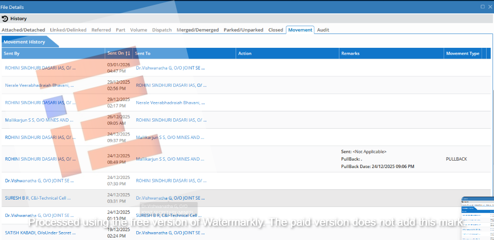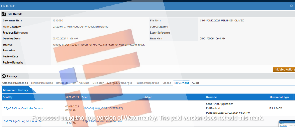 ಅದೇ ದಿನದಂದು ಇದೇ ಕಡತವು, ನೇರಳೆ ವೀರಭದ್ರಯ್ಯ ಭವಾನಿ ಅವರ ಲಾಗಿನ್ನಿಂದ ಕೈಗಾರಿಕೆ ಮತ್ತು ವಾಣಿಜ್ಯ ಇಲಾಖೆ (ಗಣಿ) ಸರ್ಕಾರದ ಕಾರ್ಯದರ್ಶಿ ರೋಹಿಣಿ ಸಿಂಧೂರಿ ಅವರ ಲಾಗಿನ್ (2;56 pm) ನಲ್ಲಿತ್ತು.