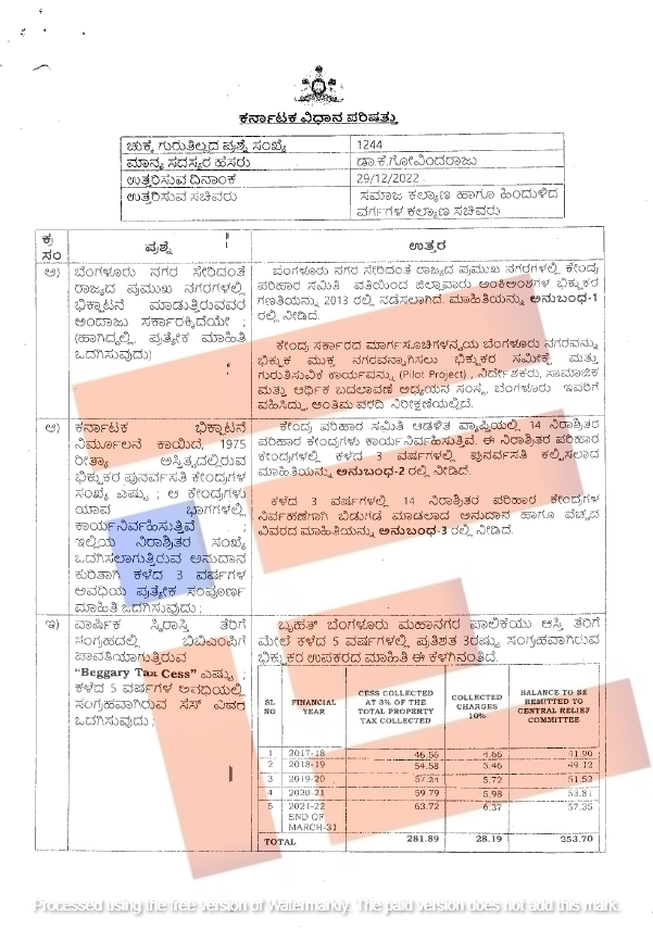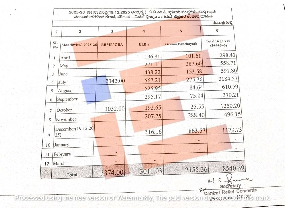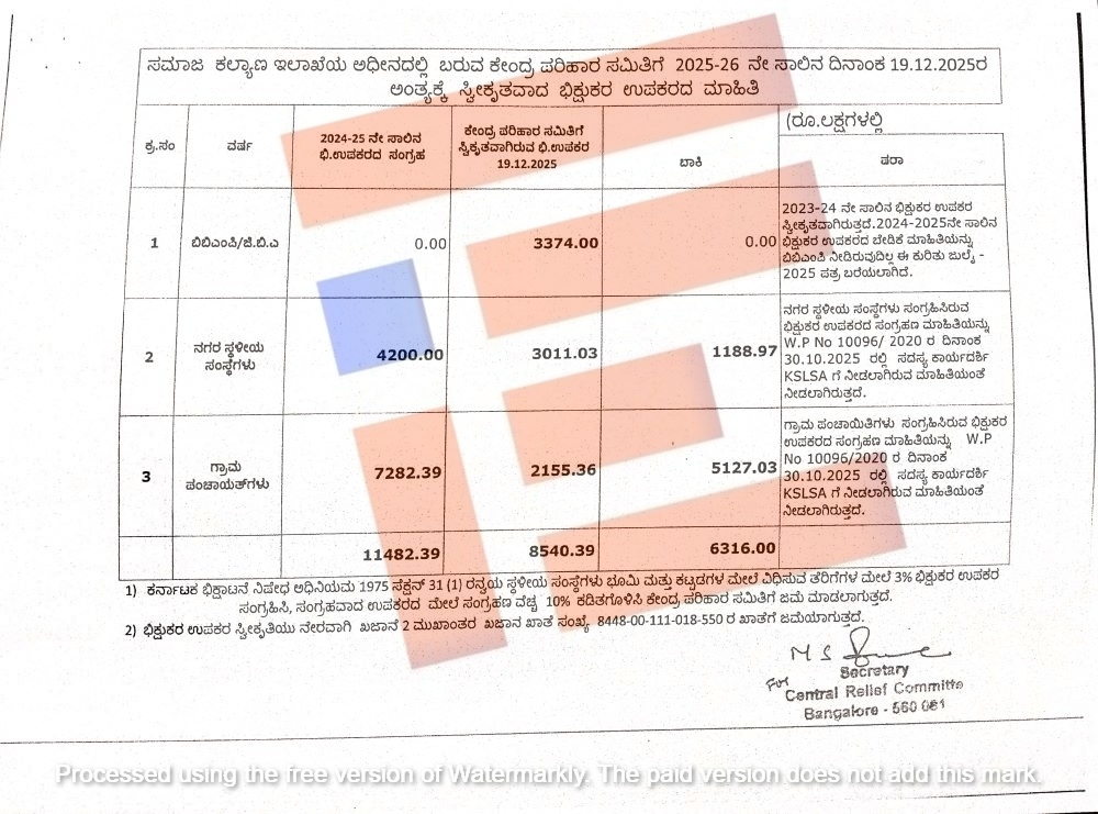 2025-26ನೇ ಸಾಲಿಗೆ ಸಂಬಂಧಿಸಿದಂತೆ ಕೇಂದ್ರ ಪರಿಹಾರ ಸಮಿತಿಗೆ ಸ್ವೀಕೃತವಾಗಿರುವ ಭಿಕ್ಷುಕರ ಕರ ಸಂಗ್ರಹ ಮತ್ತು ಇನ್ನೂ ಸ್ವೀಕೃತವಾಗಿರುವ ಕರದ ಬಗ್ಗೆ ಸಮಾಜ ಕಲ್ಯಾಣ ಇಲಾಖೆಗೆ ಕೇಂದ್ರ ಪರಿಹಾರ ಸಮಿತಿಯು ಮಾಹಿತಿ ಒದಗಿಸಿದೆ. ಈ ಮಾಹಿತಿಯ ಪ್ರತಿಯು ‘ದಿ ಫೈಲ್’ಗೆ ಲಭ್ಯವಾಗಿದೆ.