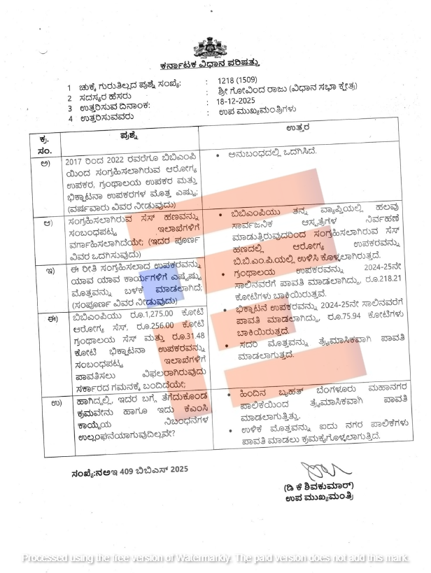 ಆದರೆ ಗ್ರೇಟರ್ ಬೆಂಗಳೂರು ಪ್ರಾಧಿಕಾರವು 2024-25ನೇ ಸಾಲಿನ ಭಿಕ್ಷುಕರ ಉಪಕರ ಬೇಡಿಕೆ ಮಾಹಿತಿಯನ್ನು ಕೇಂದ್ರ ಪರಿಹಾರ ಸಮಿತಿಗೆ ಸಲ್ಲಿಸಿಲ್ಲ. ಈ ಬಗ್ಗೆ ಕೇಂದ್ರ ಪರಿಹಾರ ಸಮಿತಿಯು 2025ರ ಜುಲೈ 25ರಂದೇ ಪತ್ರ ಬರೆದಿತ್ತು. 2025ರ ಡಿಸೆಂಬರ್ ಅಂತ್ಯದವರೆಗೂ ಜಿಬಿಎಯು ಭಿಕ್ಷುಕರ ಉಪ ಕರ ಬೇಡಿಕೆ ಕುರಿತು ಮಾಹಿತಿಯನ್ನೇ ಒದಗಿಸಿಲ್ಲ. 2023-24ನೇ ಸಾಲಿನಲ್ಲಿ ಗ್ರೇಟರ್ ಬೆಂಗಳೂರು ಪ್ರಾಧಿಕಾರವು 33.74 ಕೋಟಿ ರು.ಗಳನ್ನು ಕೇಂದ್ರ ಪರಿಹಾರ ಸಮಿತಿಗೆ ಜಮೆ ಮಾಡಿದೆ.
