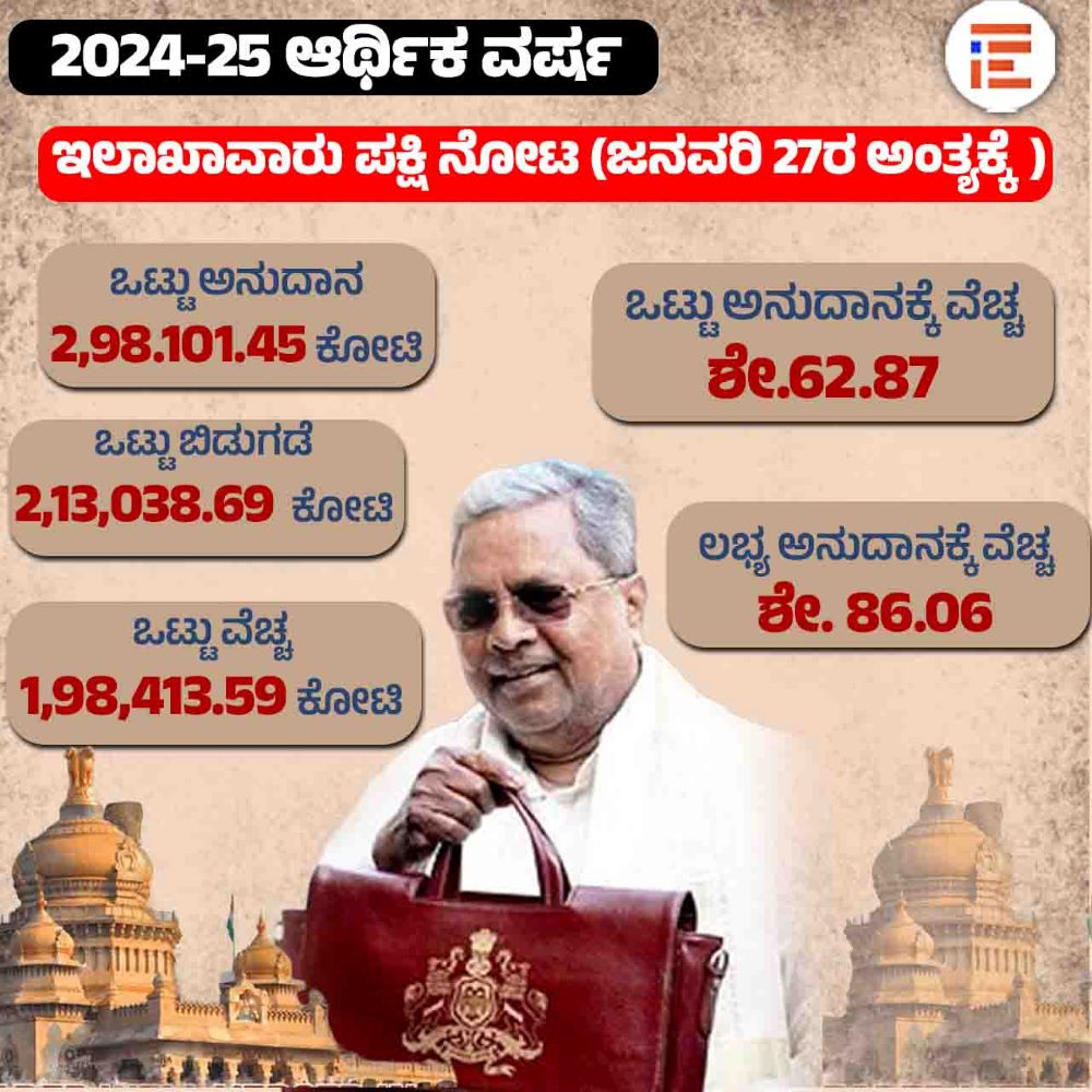 2024-25ನೇ ಸಾಲಿನಲ್ಲಿ ಜನವರಿ 27ರ ಅಂತ್ಯಕ್ಕೆ ಒಟ್ಟು ಅನುದಾನಕ್ಕೆ ಶೇ. 62.87ರಷ್ಟು ವೆಚ್ಚವಾಗಿದ್ದರೇ ಲಭ್ಯ ಅನುದಾನಕ್ಕೆ ಶೇ. 86.06ರಷ್ಟು ವೆಚ್ಚವಾಗಿತ್ತು.