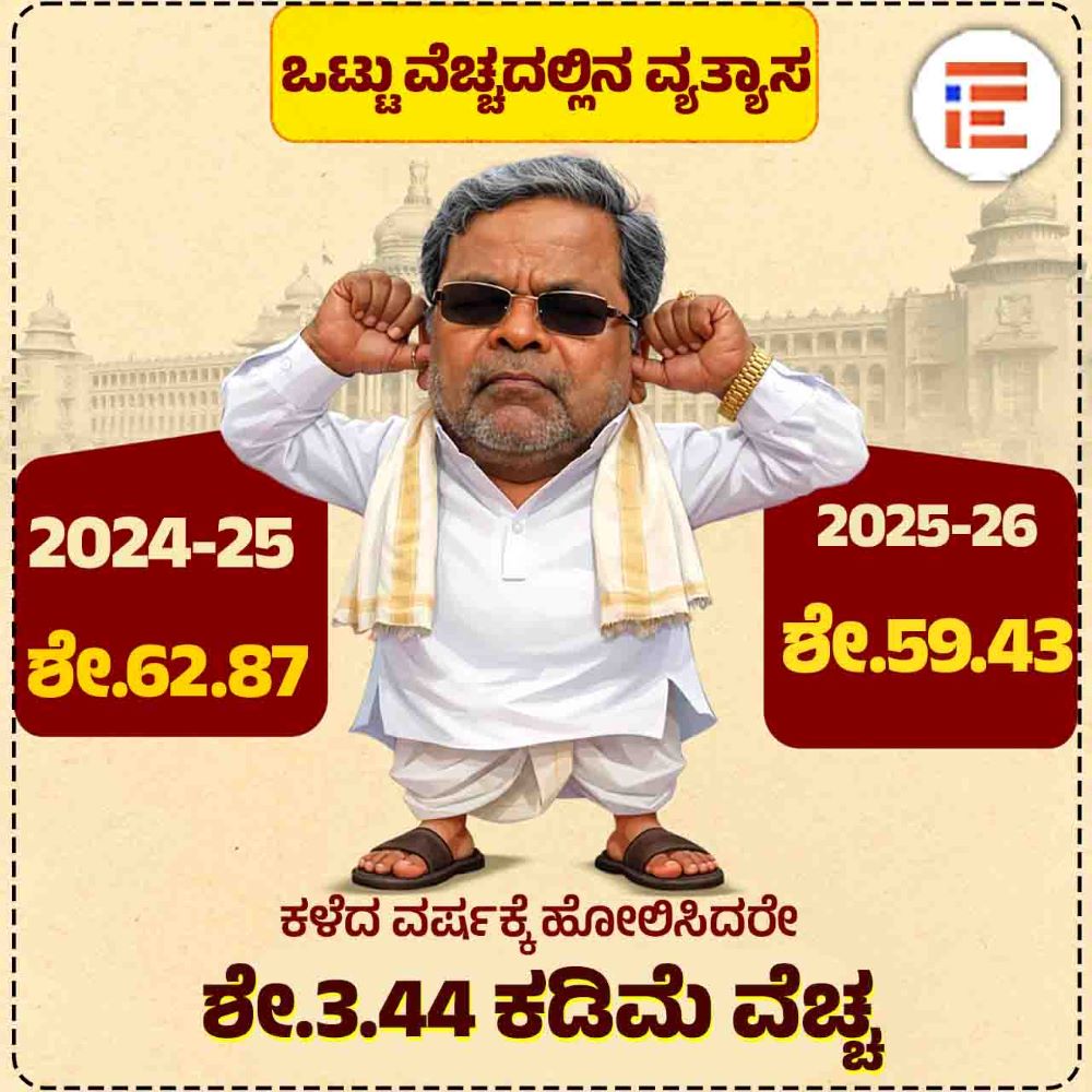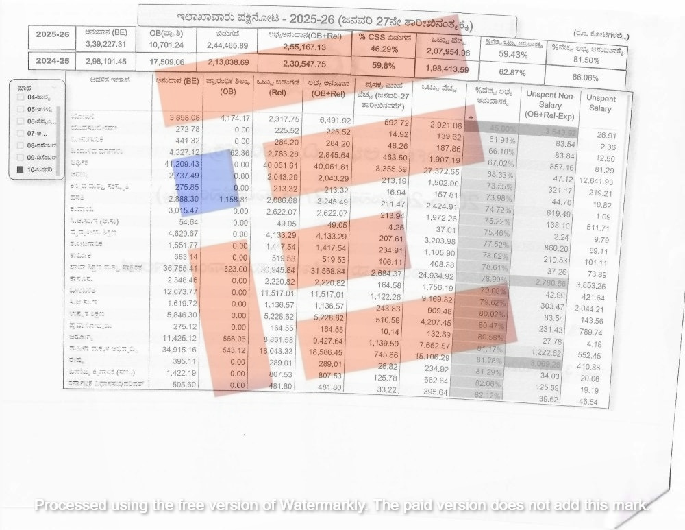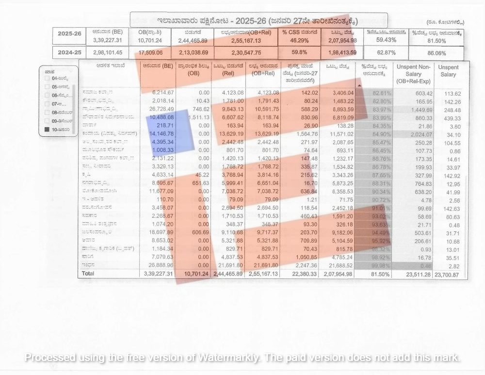 ಆದರೆ 2025-26ನೇ ಸಾಲಿನ ಜನವರಿ 27ರ ಅಂತ್ಯಕ್ಕೆ ಒಟ್ಟು ಅನುದಾನಕ್ಕೆ ಶೇ.59.43 ಮತ್ತು ಲಭ್ಯ ಅನುದಾನಕ್ಕೆ ಶೇ. 81.50ರಷ್ಟು ವೆಚ್ಚವಾಗಿರುವುದು ಅಂಕಿ ಅಂಶಗಳಿಂದ ತಿಳಿದು ಬಂದಿದೆ.