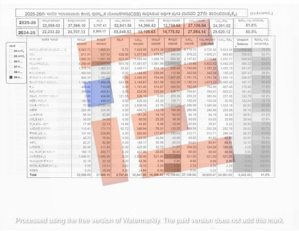 ಕೇಂದ್ರ ಪುರಸ್ಕೃತ ಯೋಜನೆಗಳಡಿಯಲ್ಲಿಯೂ 2024-25ನೇ ಸಾಲಿನಲ್ಲಿ 29,620.12 ಕೋಟಿಯಷ್ಟು ವೆಚ್ಚವಾಗಿದ್ದರೇ 2025-26ನೇ ಸಾಲಿನಲ್ಲಿ 24,391.02 ಕೋಟಿ ಖರ್ಚಾಗಿದೆ. ಕಳೆದ ವರ್ಷಕ್ಕೆ ಹೋಲಿಸಿದರೇ 5,239.1 ಕೋಟಿಯಷ್ಟು ಕಡಿಮೆ ವೆಚ್ಚವಾದಂತಾಗಿದೆ.