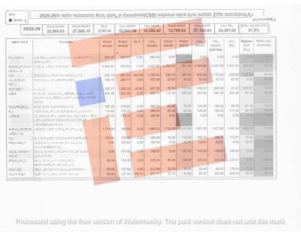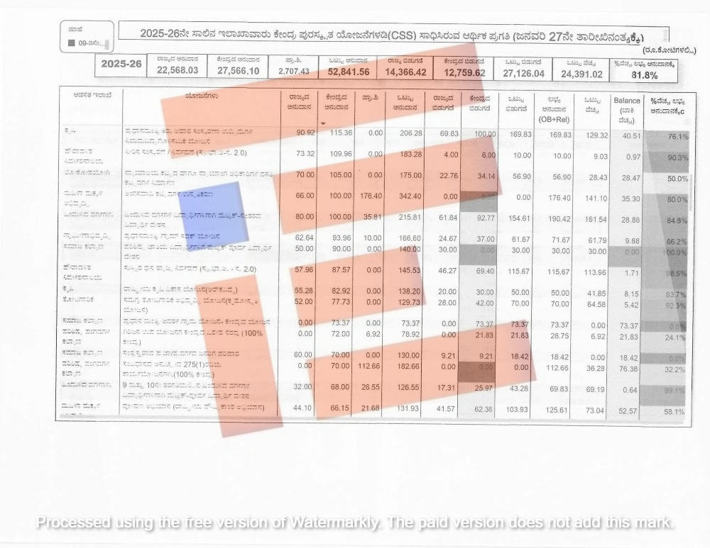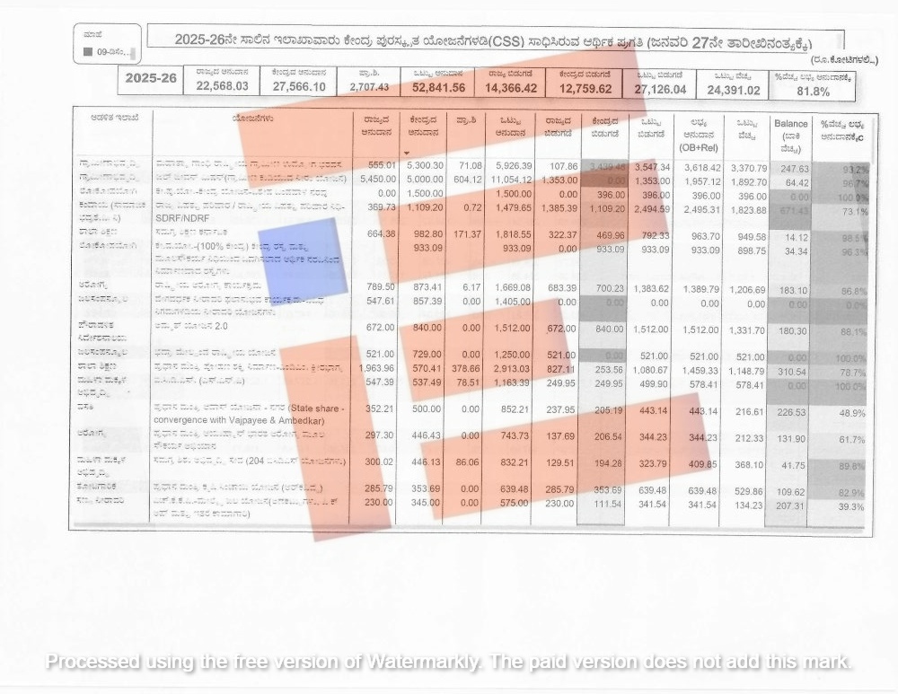 ಕೇಂದ್ರ ಮತ್ತು ರಾಜ್ಯ ಸರ್ಕಾರವು ಕೇಂದ್ರ ಪುರಸ್ಕೃತ ಯೋಜನೆಗಳಡಿಯಲ್ಲಿ 2024-25ನೇ ಸಾಲಿನಲ್ಲಿ 27,884.14 ಕೋಟಿ ರು ಬಿಡುಗಡೆ ಮಾಡಿದ್ದರೇ 2025-26ರಲ್ಲಿ 27,126.04 ಕೋಟಿ ರು ಬಿಡುಗಡೆ ಮಾಡಿದೆ. 2024-25ರಲ್ಲಿ 29,620.12 ಕೋಟಿ ರು ವೆಚ್ಚ ಮಾಡಿದೆ. ಇದು ಅನುದಾನ ಬಿಡುಗಡೆಯಾಗಿದ್ದಕ್ಕಿಂತಲೂ ಅಂದರೇ 1,735.98 ಕೋಟಿ ರು ಹೆಚ್ಚಿಗೆ ವೆಚ್ಚ ಮಾಡಿದೆ. ಅದೇ ರೀತಿ 2025-26ರ ಜನವರಿ 27ರ ಅಂತ್ಯಕ್ಕೆ 24,391.02 ಕೋಟಿ ರು ವೆಚ್ಚ ಮಾಡಿದೆ. ಬಿಡುಗಡೆ ಮಾಡಿದ್ದ ಹಣದಲ್ಲಿಯೇ ಇನ್ನೂ 2,735.02 ಕೋಟಿ ರು ಗಳನ್ನು ವೆಚ್ಚಕ್ಕೆ ಬಾಕಿ ಇರುವುದು ಗೊತ್ತಾಗಿದೆ.