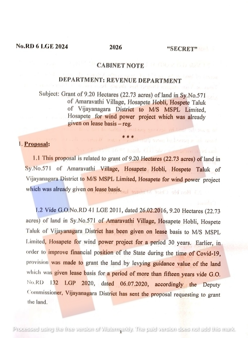 ವಿಜಯನಗರ ಜಿಲ್ಲೆ ಹೊಸಪೇಟೆ ತಾಲೂಕಿನ ಹೊಸಪೇಟೆ ಹೋಬಳಿಯ ಅಮರಾವತಿ ಗ್ರಾಮದಲ್ಲಿ ಸರ್ವೆ ನಂಬರ್‍‌ 571ರಲ್ಲಿ 22.73 ಎಕರೆ ವಿಸ್ತೀರ್ಣದ ಸರ್ಕಾರಿ ಜಮೀನಿದೆ. ಈ ಜಮೀನನ್ನು ಎಂಎಸ್‌ಪಿಎಲ್‌ ಗ್ಯಾಸಸ್ ಲಿಮಿಟೆಡ್‌ನ ಪವನ ವಿದ್ಯುತ್‌ ಯೋಜನೆಗಾಗಿ 2011ರ ಸರ್ಕಾರದ ಆದೇಶದ ಪ್ರಕಾರ 2016ರ ಫೆ.26ರಂದು ಅಂದರೇ ಸಿದ್ದರಾಮಯ್ಯ ಅವರ ಮೊದಲ ಅವಧಿಯಲ್ಲಿ 30 ವರ್ಷಗಳ ಅವಧಿಗೆ ಗುತ್ತಿಗೆ ಆಧಾರದ ಮೇಲೆ ಮಂಜೂರಾಗಿತ್ತು.
