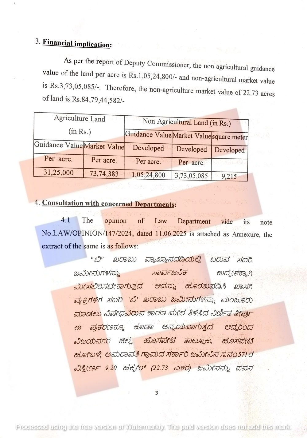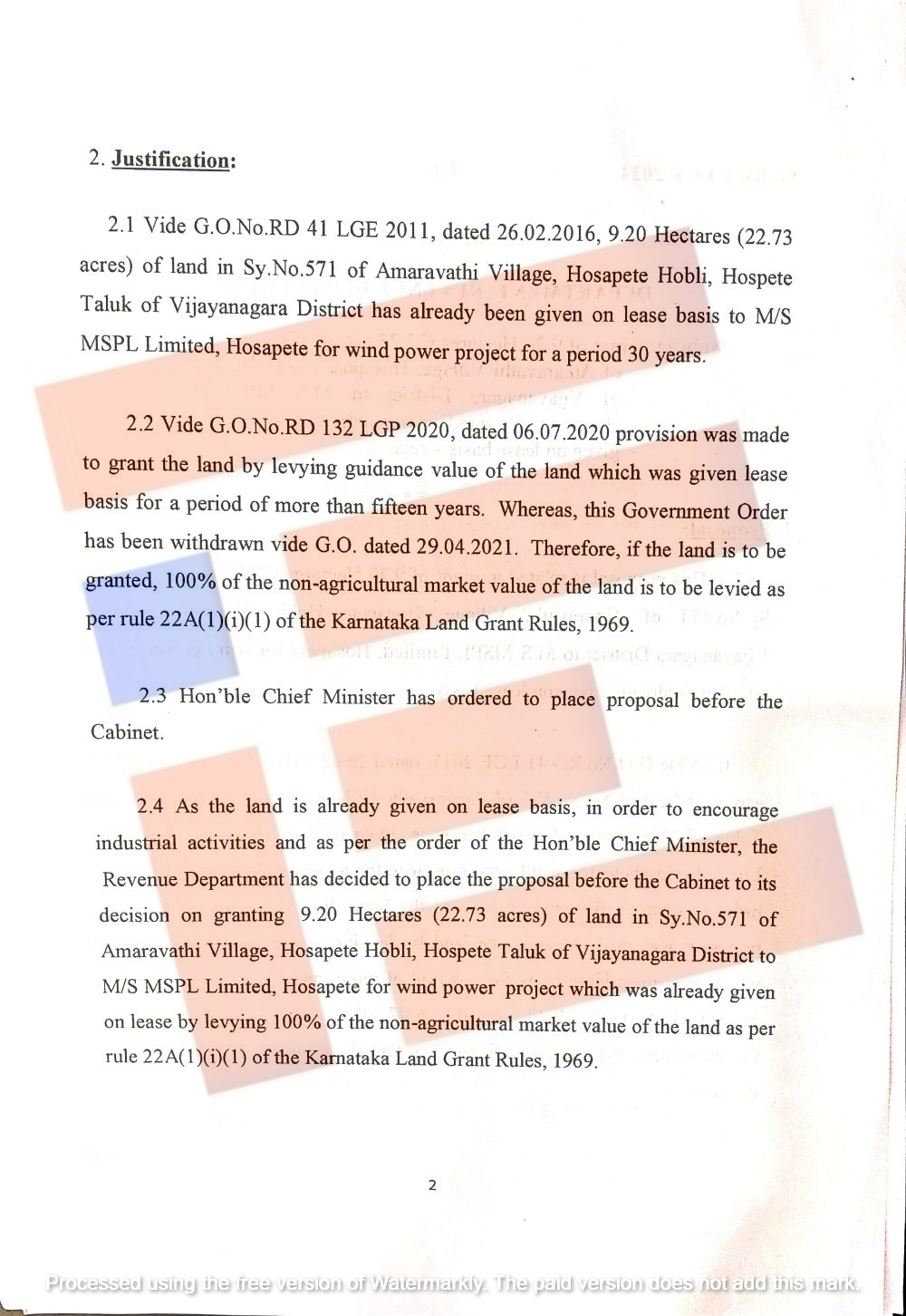 ಎಂಎಸ್‌ಪಿಎಲ್‌ ಗ್ಯಾಸ್‌ ಲಿಮಿಟೆಡ್‌ಗೆ 22.73 ಎಕರೆ ವಿಸ್ತೀರ್ಣದ ಸರ್ಕಾರಿ ಜಮೀನನ್ನು ಮಂಜೂರು ಮಾಡಲು ಕಂದಾಯ ಇಲಾಖೆಯು ಅಭಿಪ್ರಾಯ ಕೋರಿತ್ತು. ಕಂದಾಯ ಇಲಾಖೆಯ ಪ್ರಸ್ತಾವವನ್ನು ಪರಿಶೀಲಿಸಿದ್ದ  ಕಾನೂನು ಇಲಾಖೆಯು (LAW/OPINION/147/2024, DATED 11.06.2025) ಅಸಮ್ಮತಿ ವ್ಯಕ್ತಪಡಿಸಿತ್ತು.