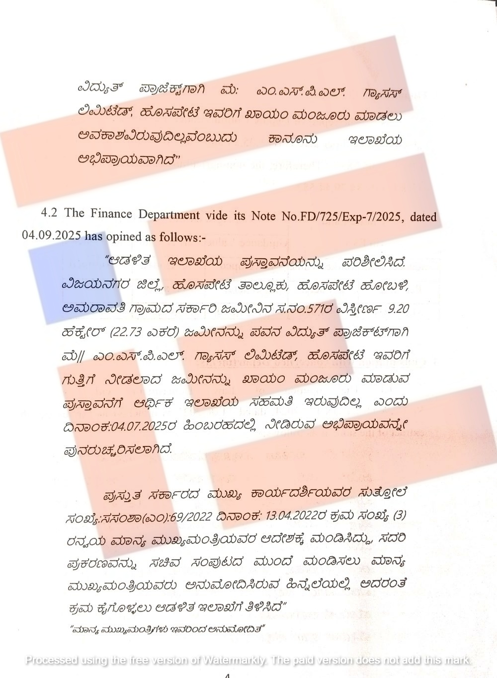 ‘ಆಡಳಿತ ಇಲಾಖೆಯ ಪ್ರಸ್ತಾವನೆಯನ್ನು ಪರಿಶೀಲಿಸಲಾಗಿದೆ. ವಿಜಯನಗರ ಜಿಲ್ಲೆ ಹೊಸಪೇಟೆ ತಾಲೂಕಿನ ಹೊಸಪೇಟೆ ಹೋಬಳಿಯ ಅಮರಾವತಿ ಗ್ರಾಮದ ಸರ್ಕಾರಿ ಜಮೀನಿನ ಸರ್ವೆನಂಬರ್ 571ರ ವಿಸ್ತೀರ್ಣ 9.20 ಹೆಕ್ಟೇರ್ (22.73 ಎಕರೆ) ಜಮೀನನ್ನು ಪವನ ವಿದ್ಯುತ್‌ ಪ್ರಾಜೆಕ್ಟ್‌ಗಾಗಿ ಎಂಎಸ್‌ಪಿಎಲ್ ಗ್ಯಾಸಸ್ ಲಿಮಿಟೆಡ್‌ಗೆ ಗುತ್ತಿಗೆ ನೀಡಲಾದ ಜಮೀನನ್ನು ಖಾಯಂ ಆಗಿ ಮಂಜೂರು ಮಾಡುವ ಪ್ರಸ್ತಾವನೆಗೆ ಆರ್ಥಿಕ ಇಲಾಖೆಯ ಸಹಮತಿ ಇರುವುದಿಲ್ಲ ಎಂದು 2025ರ ಜುಲೈ 4ರಂದೇ ಹಿಂಬರಹದಲ್ಲಿ ನೀಡಿರುವ ಅಭಿಪ್ರಾಯವನ್ನೇ ಪುನರುಚ್ಚರಿಸಲಾಗಿದೆ,’ ಎಂದು ಅಭಿಪ್ರಾಯದಲ್ಲಿ ತಿಳಿಸಿರುವುದು ಗೊತ್ತಾಗಿದೆ.