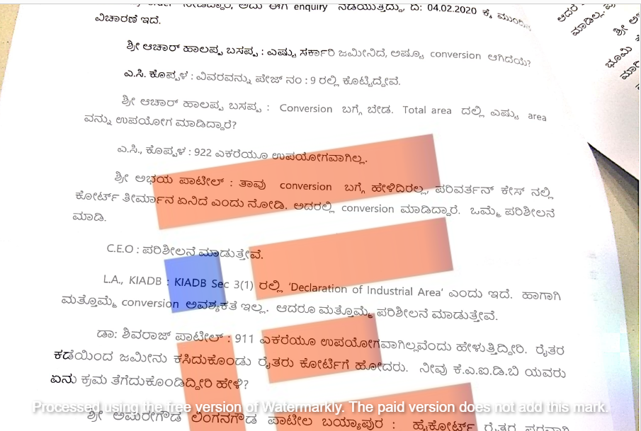 900 ಎಕರೆ ಜಾಗದಲ್ಲಿ ಕೈಗಾರಿಕೆಯನ್ನೇ ಸ್ಥಾಪಿಸಿಲ್ಲ ಎಂದು ಕರ್ನಾಟಕ ಕೈಗಾರಿಕೆ ಪ್ರದೇಶಾಭಿವೃದ್ಧಿ ಮಂಡಳಿ(ಕೆಐಎಡಿಬಿ) ಮುಖ್ಯ ಕಾರ್ಯನಿರ್ವಹಣಾಧಿಕಾರಿ ಕರ್ನಾಟಕ ವಿಧಾನಸಭೆಯ ಅಂದಾಜು ಸಮಿತಿ ಮುಂದೆ ಒಪ್ಪಿಕೊಂಡಿದ್ದರು.