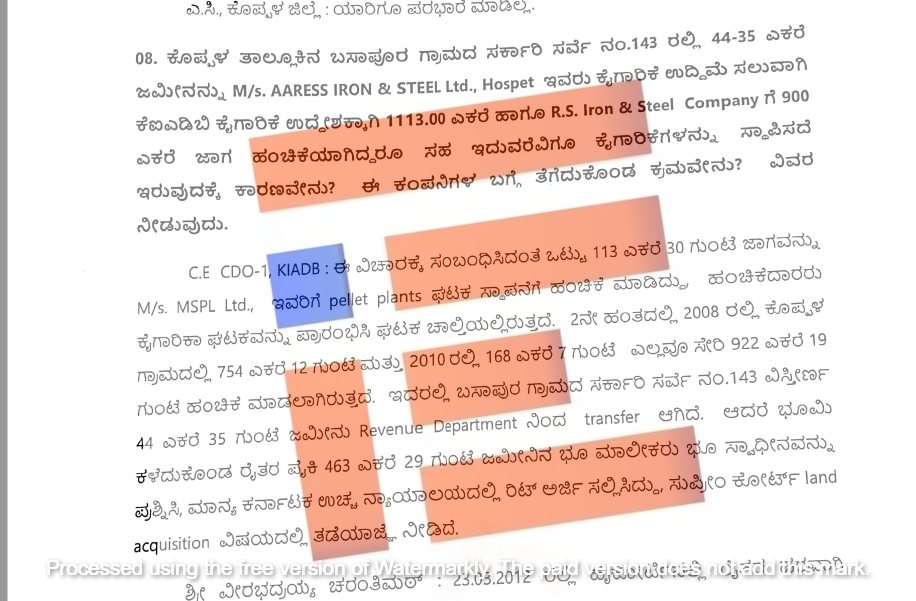 ಆದರೆ 922 ಎಕರೆಯನ್ನು ಕಂಪನಿಯು ಬಳಸಿಕೊಂಡಿಲ್ಲ ಎಂದು ಖುದ್ದು ಕೊಪ್ಪಳ ಉಪ ವಿಭಾಗಾಧಿಕಾರಿ ಅಂದಾಜು ಸಮಿತಿ ಮುಂದೆ ಹೇಳಿಕೆ ನೀಡಿದ್ದರು. ಈ ಮಧ್ಯೆ ರೈತರು ನ್ಯಾಯಾಲಯ ಮೆಟ್ಟಿಲೇರಿದ್ದರು. ಆದರೆ ಕೆಐಎಡಿಬಿಯು ಒಂದೇ ಒಂದು ಕ್ರಮ ಕೈಗೊಂಡಿಲ್ಲ ಎಂದು ತಿಳಿದು ಬಂದಿದೆ. ಅಲ್ಲದೆ ನ್ಯಾಯಾಲಯದಲ್ಲಿ ಪ್ರಕರಣ ಇರುವುದಕ್ಕೂ ಜಮೀನು ಹಿಂಪಡೆಯುವುದಕ್ಕೆ ಯಾವುದೇ ಸಂಬಂಧ ಇರದಿದ್ದರೂ ನ್ಯಾಯಾಲಯದಲ್ಲಿ ಪ್ರಕರಣದ ವಿಚಾರಣೆ ನಡೆಯುತ್ತಿದೆ ಎಂಬ ನೆಪವೊಡ್ಡಿ ಕಂಪನಿಗೆ ರಕ್ಷಣೆ ಒದಗಿಸಿತ್ತು.