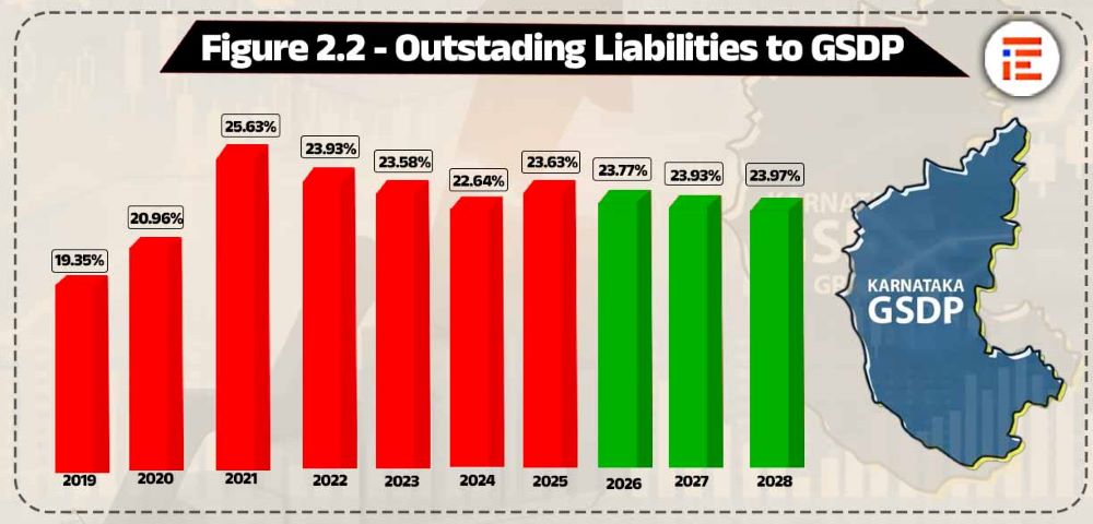 ರಾಜ್ಯದ ಸಾಲ ಬಾಧ್ಯತೆ ಹಾಗೂ ಜಿ.ಎಸ್.ಡಿ.ಪಿ. (ರಾಜ್ಯದ ಒಟ್ಟಾರೆ ಆಂತರಿಕ ಉತ್ಪಾದನೆ) ಅನುಪಾತವು 2021ರಲ್ಲಿ ಶೇಕಡಾ 25.68ರಷ್ಟು ಇದು. ನಂತರ, ಇಳಿಕೆ ಕಂಡ ಈ ಪ್ರಮಾಣವು 2023ರಲ್ಲಿ ಶೇಕಡಾ 23.58ರಷ್ಟಾಯಿತು. ಅಂದಾಜಿನ ಪ್ರಕಾರ 2028ರ ವೇಳೆಗೆ ಇದು ಶೇಕಡಾ 24ರಷ್ಟು ಇರಲಿದೆ ಎಂದು ಅಂದಾಜಿಸಲಾಗಿದೆ. ರಾಜ್ಯದ ಸಾಲದ ಹೊರೆಯು ಬರುವ ವರ್ಷಗಳಲ್ಲೂ ಮುಂದುವರಿಯಲಿದೆ ಎಂಬುದನ್ನು ಹಾಗೂ ಜಾಗರೂಕ ವಿತ್ತೀಯ ನಿರ್ವಹಣೆಯ ಅಗತ್ಯವನ್ನು ಇದು ಸೂಚಿಸುತ್ತದೆ ಎಂದು ವರದಿಯಲ್ಲಿ ಗಮನಸೆಳೆಯಲಾಗಿದೆ.