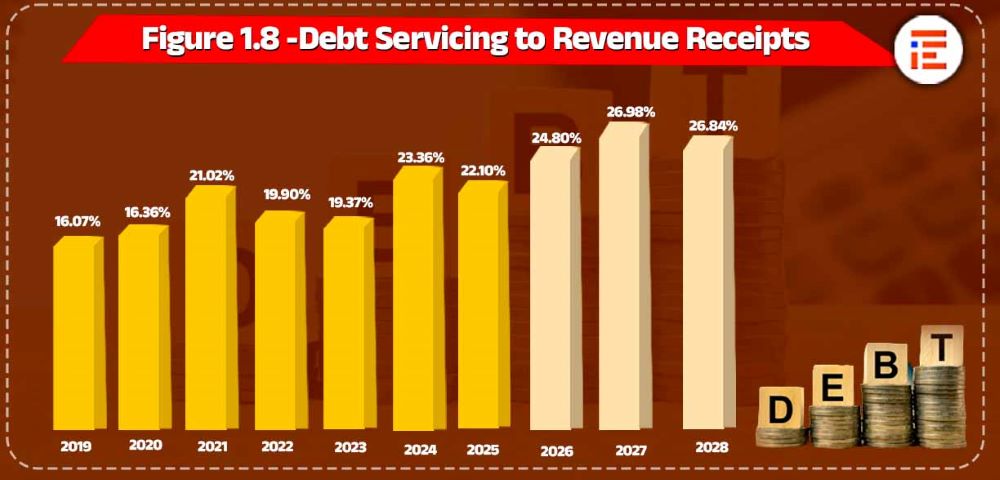 ಸಾಲ ಮರುಪಾವತಿ ಬಾಬ್ತಿನ ಹೊರೆಯು 2028ರ ವೇಳೆಗೆ ರಾಜಸ್ವ ಸಂಗ್ರಹದ ಶೇಕಡಾ 26.84ರಷ್ಟಾಗಲಿದ್ದು, ಇದು 2019ರ ಶೇಕಡಾ 14.69ಕ್ಕೆ ಹೋಲಿಸಿದರೆ ಗಣನೀಯ ಪ್ರಮಾಣದ ಹೆಚ್ಚಳವಾಗಲಿದೆ. ಇಳಿಕೆ ಹಾದಿಯಲ್ಲಿರುವ ಬಂಡವಾಳ ವೆಚ್ಚವು 2028ರ ವೇಳೆಗೆ ಒಟ್ಟಾರೆ ವೆಚ್ಚಕ್ಕೆ ಹೋಲಿಸಿದರೆ ಶೇಕಡಾ 17.15.ರಷ್ಟಾಗಲಿದೆ. ಹಾಗೆಯೇ, ಒಟ್ಟಾರೆ ವೆಚ್ಚಕ್ಕೆ ಹೋಲಿಸಿದರೆ ಸಾಲ ಮರುಪಾವತಿ ಬಾಬ್ತು 2019ರಲ್ಲಿ ಶೇಕಡಾ12.36ರಷ್ಟು ಇದ್ದುದು 2028ರ ವೇಳೆಗೆ ಶೇಕಡಾ 20.38ರಷ್ಟಾಗಲಿದೆ.