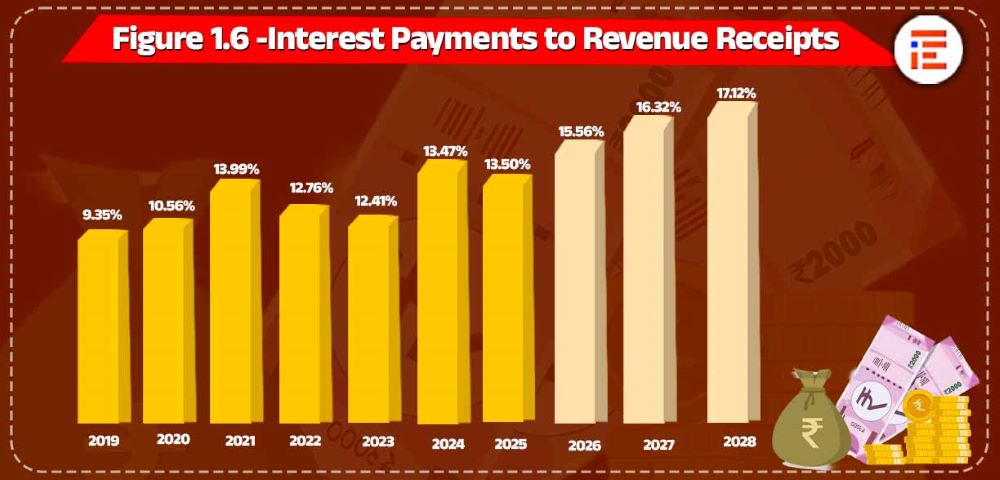 ಇದು 2024ರ ವೇಳೆಗೆ ಶೇಕಡಾ 13.47ರಷ್ಟಕ್ಕೆ ಏರಿಕೆಯಾಯಿತು. ಬರುವ 2028ರ ವೇಳೆಗೆ ಬಡ್ಡಿ ಪ್ರಮಾಣ ಮತ್ತಷ್ಟು ಏರಿಕೆಯಾಗಿ ಶೇಕಡಾ 17.12ರಷ್ಟನ್ನು ತಲುಪುವ ಸಾಧ್ಯತೆ ಇದೆ. ಹೀಗಾಗಿ ಇನ್ನಿತರ ಆದ್ಯತಾ ವೆಚ್ಚಗಳಿಗೆ ಬೇಕಾದ ಹಣದ ಲಭ್ಯತೆಗೆ ತೊಡಕಾಗುವ ಸಾಧ್ಯತೆಗಳಿವೆ ಎಂದು ತಜ್ಞರು ಗಮನಸೆಳೆದಿದ್ದಾರೆ.