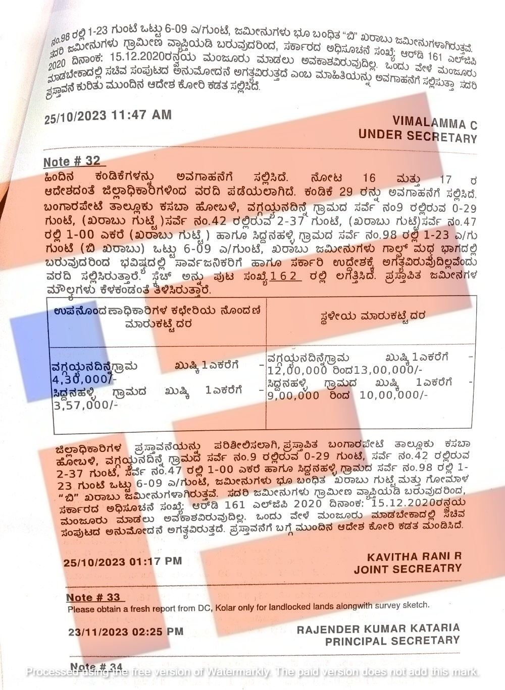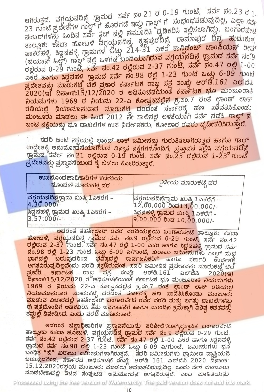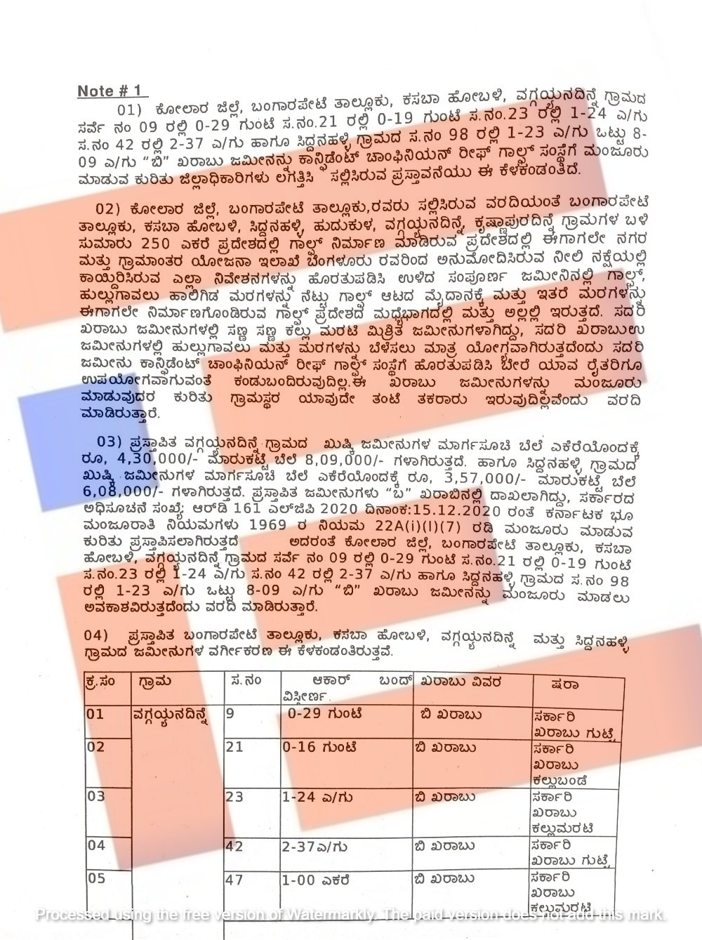 ಭವಿಷ್ಯದಲ್ಲಿ ಸಾರ್ವಜನಿಕರಿಗೆ ಹಾಗೂ ಸರ್ಕಾರಿ ಉದ್ದೇಶಕ್ಕೆ ಈ ಜಮೀನುಗಳು ಅಗತ್ಯವಿಲ್ಲ ಎಂದು ನಿರ್ಧರಿಸಿದ್ದ ಕೋಲಾರ ಜಿಲ್ಲಾಧಿಕಾರಿಯು, ಕರ್ನಾಟಕ ಭೂ ಮಂಜೂರಾತಿ ನಿಯಮಗಳು 1969ರ ನಿಯಮ ನಿಯಮ 22-ಎನ ಕ್ರಮ ಸಂಖ್ಯೆ 7ರಂತೆ ಲ್ಯಾಂಡ್ ಲಾಕ್ ಅಡಿಯಲ್ಲಿ ಮಾರುಕಟ್ಟೆ ದರದಂತೆ ಸರ್ಕಾರಕ್ಕೆ ಹಣ ಪಾವತಿಸಿಕೊಂಡು ಮಂಜೂರು ಮಾಡಲು ವರದಿ ನೀಡಿದ್ದರು.