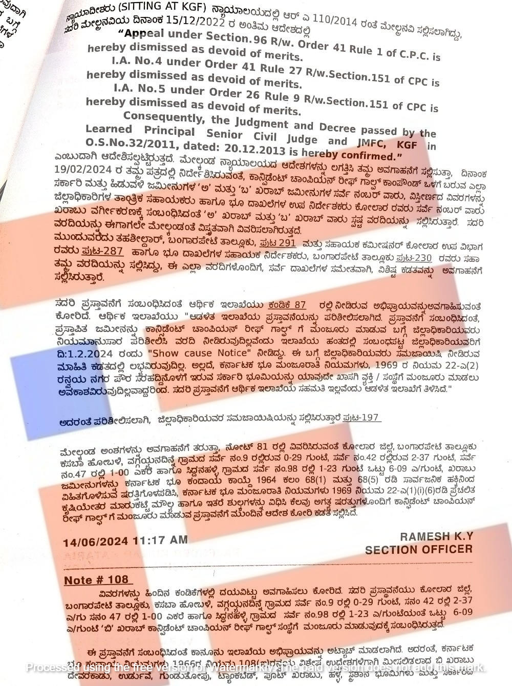 ‘ಈ ಜಮೀನುಗಳು ಕಾನ್ಫಿಡೆಂಟ್ ಚಾಂಪಿಯನ್ ರೀಫ್ ಸಂಸ್ಥೆ ಹೊರತುಪಡಿಸಿ ಬೇರಾವುದೇ ರೈತರಿಗೆ ಅಥವಾ ಸರ್ಕಾರದ ಯೋಜನೆಗಳಿಗೆ ಉಪಯುಕ್ತವಾಗಿರುವುದಿಲ್ಲ. ಈ ಜಮೀನುಗಳನ್ನು ಸಂಸ್ಥೆಗೆ ಮಂಜೂರು ಮಾಡಲು ಗ್ರಾಮಸ್ಥರ ತಂಟೆ ತಕರಾರು ಇರುವುದಿಲ್ಲ,’ ಎಂದು ಕಂದಾಯ ಇಲಾಖೆಯ ಶಾಖಾಧಿಕಾರಿ ಟಿಪ್ಪಣಿ ಹಾಳೆಯಲ್ಲಿ ಉಲ್ಲೇಖಿಸಿದ್ದರು.