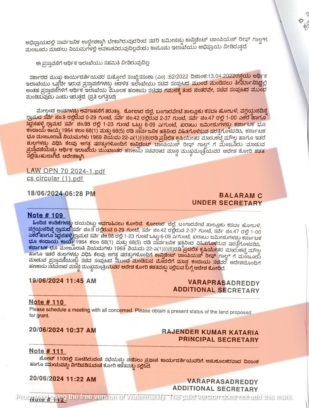 ಈ ಜಮೀನುಗಳನ್ನು ಮಂಜೂರು ಮಾಡುವ ಸಂಬಂಧ ಜಿಲ್ಲಾಧಿಕಾರಿಗಳಿಂದ ಹೊಸದಾಗಿ ಸ್ಕೆಚ್ ದಾಖಲೆಗಳೊಂದಿಗೆ ಮತ್ತೊಮ್ಮೆ ಪ್ರಸ್ತಾವ ಸಲ್ಲಿಸಬೇಕು 2023ರ ನವೆಂಬರ್ 23ರಂದು ಇಲಾಖೆಯ ಸರ್ಕಾರದ ಪ್ರಧಾನ ಕಾರ್ಯದರ್ಶಿ ರಾಜೇಂದರ್ ಕುಮಾರ್ ಕಟಾರಿಯಾ ಅವರು ಸೂಚಿಸಿದ್ದರು.