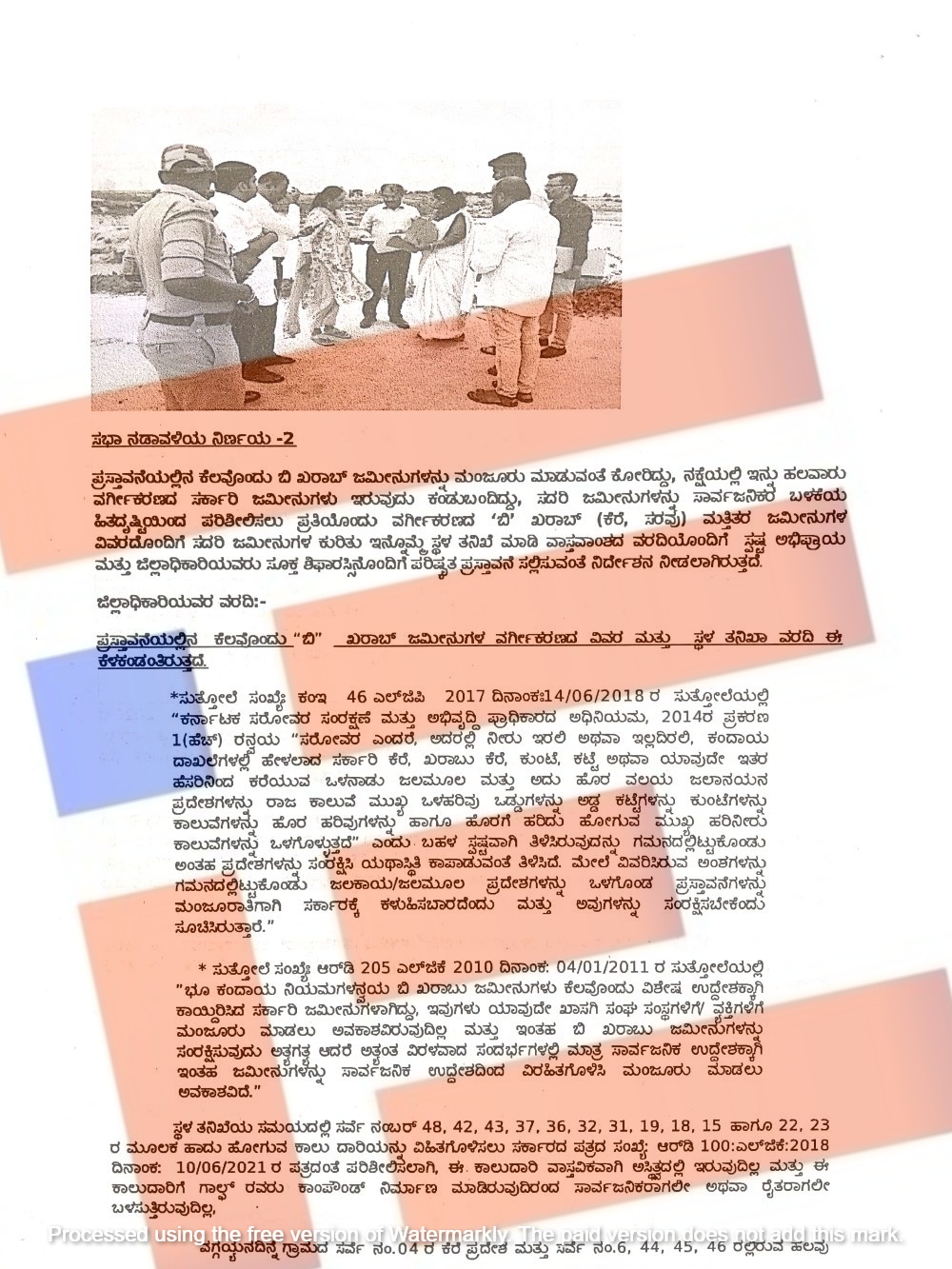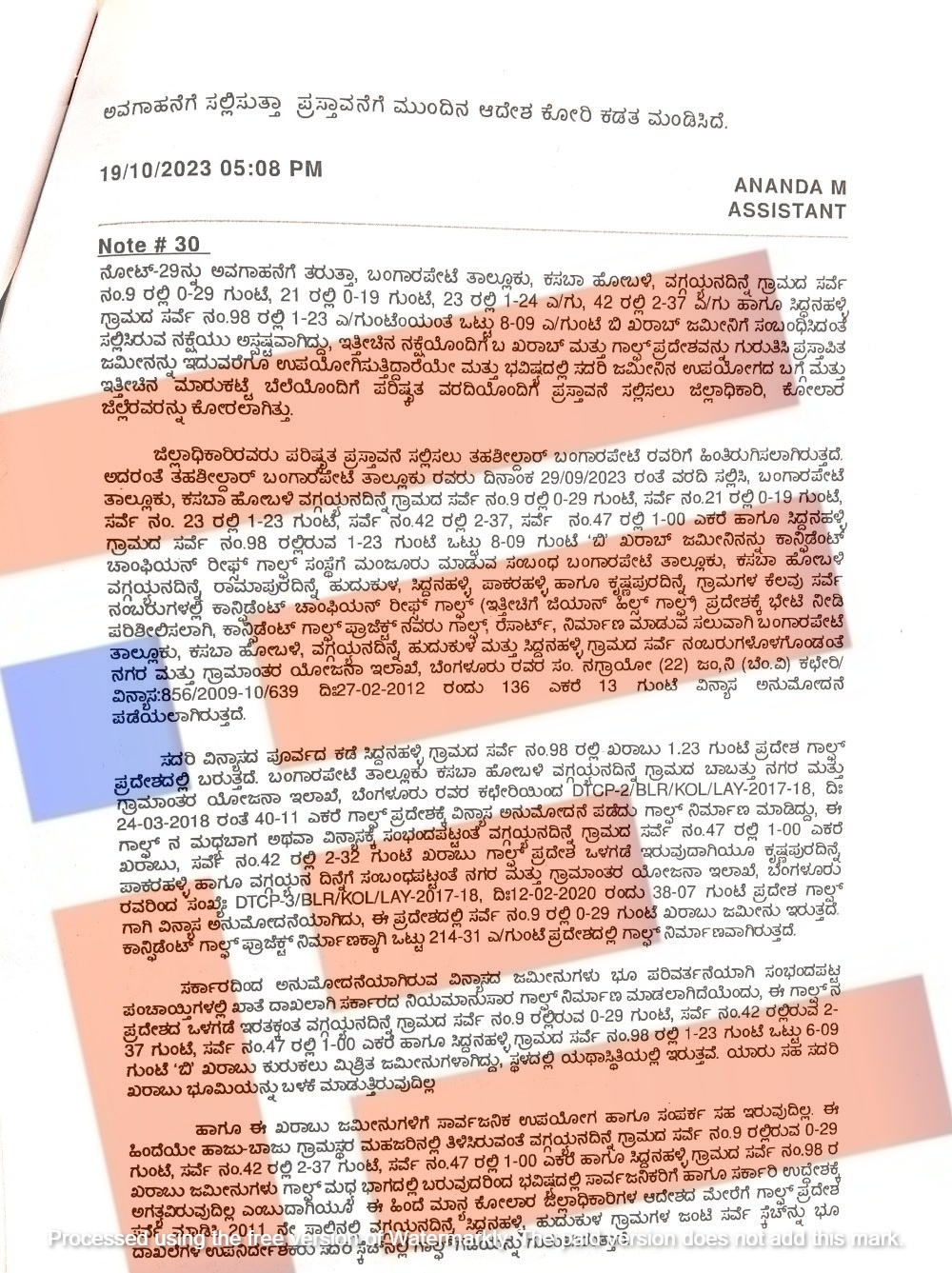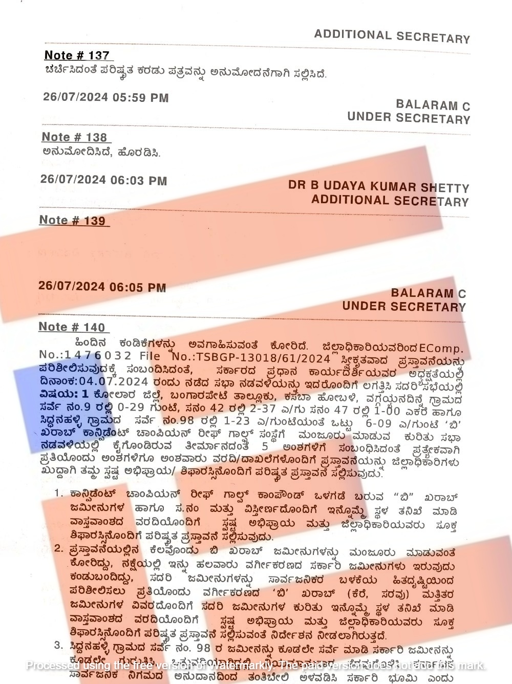 ಈ ಅಭಿಪ್ರಾಯವನ್ನಾಧರಿಸಿ ಜಮೀನುಗಳನ್ನು ಮಂಜೂರು ಮಾಡಲು ಪ್ರಸ್ತಾವ ಸಲ್ಲಿಸಲು ಆದೇಶ ಕೋರಿ ಕಡತ ಮಂಡಿಸಲಾಗಿತ್ತು. ಆದರೆ ಇದನ್ನು ಇಲಾಖೆಯ ಮತ್ತೊಬ್ಬ ಅಧಿಕಾರಿಯು ಈ ಪ್ರಸ್ತಾವವಕ್ಕೆ ಒಪ್ಪಿಗೆ ಸೂಚಿಸಿರಲಿಲ್ಲ. ಈ ಪ್ರಸ್ತಾಪಿತ ಜಮೀನುಗಳು ಭೂ ಬಂಧಿತ ಬಿ ಖರಾಬು ಜಮೀನುಗಳಾಗಿವೆ. ಅಲ್ಲದೇ ಈ ಜಮೀನು ಗ್ರಾಮೀಣ ವ್ಯಾಪ್ತಿಯಡಿ ಬರಲಿದೆ. ಹೀಗಾಗಿ ಮಂಜೂರು ಮಾಡಲು ಅವಕಾಶವಿಲ್ಲ ಎಂದು ಸ್ಪಷ್ಟ ಅಭಿಪ್ರಾಯ ನೀಡಿದ್ದರು.