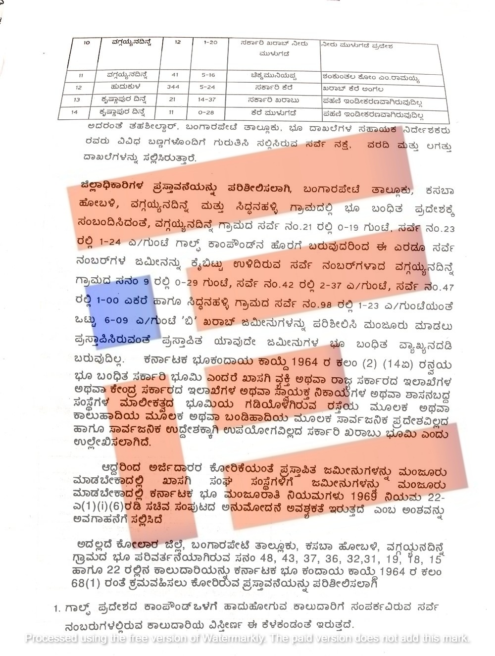 ‘ಜಿಲ್ಲಾಧಿಕಾರಿಗಳ ಪ್ರಸ್ತಾವನೆಯನ್ನು ಪರಿಶೀಲಿಸಲಾಗಿದೆ. ವಗ್ಗಯ್ಯದಿನ್ನೆ ಗ್ರಾಮದ ಸರ್ವೆ ನಂಬರ್ 21ರಲ್ಲಿ 0-19 ಗುಂಟೆ, ಸರ್ವೇ ನಂಬರ್ 23ರಲ್ಲಿ 1-24 ಎಕರೆ ಜಮೀನು ಗಾಲ್ಫ್ ಕಾಂಪೌಂಡ್ನ ಹೊರಗಿದೆ. ಈ ಎರಡೂ ಸರ್ವೆ ನಂಬರ್ಗಳ ಜಮೀನನ್ನು ಕೈ ಬಿಟ್ಟು ಉಳಿದಿರುವ ಸರ್ವೇ ನಂಬರ್ಗಳಾದ ವಗ್ಗಯ್ಯದಿನ್ನೆ ಗ್ರಾಮದ ಸರ್ವೆ ನಂಬರ್ 9ರಲ್ಲಿ 0-29 ಗುಂಟೆ, ಸರ್ವೆ ನಂಬರ್ 42ರಲ್ಲಿ 2-37 ಎಕರೆ, ಸರ್ವೆ ನಂಬರ್ 47ರಲ್ಲಿ 1 ಎಕರೆ, ಸಿದ್ದನಹಳ್ಳಿ ಗ್ರಾಮದ ಸರ್ವೆ ನಂಬರ್ 98ರಲ್ಲಿ 1-23 ಎಕರೆ ಸೇರಿ ಒಟ್ಟು 6-09 ಎಕರೆ ಬಿ ಖರಾಬು ಜಮೀನುಗಳು ಭೂ ಬಂಧಿತ ವ್ಯಾಖ್ಯಾನದಡಿಯಲ್ಲಿ ಬರುವುದಿಲ್ಲ,’ ಎಂದು ಕಂದಾಯ ಇಲಾಖೆಯು ತೀರ್ಮಾನಕ್ಕೆ ಬಂದಿತ್ತು.