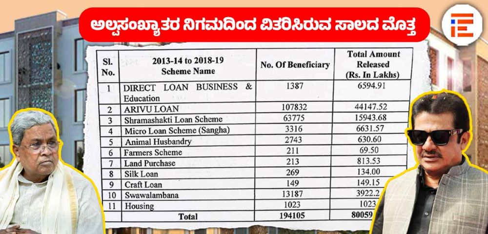 2013-14ರಿಂದ 2018-19ರವರೆಗೆ ಉದ್ಯಮ ಮತ್ತು ಶಿಕ್ಷಣಕ್ಕಾಗಿ 1,387 ಮಂದಿ 65.94 ಕೋಟಿ ಸಾಲ ಪಡೆದಿದ್ದರು. ಅರಿವು ಸಾಲ ಯೋಜನೆಯಡಿಯಲ್ಲಿ 1,07, 832 ಮಂದಿ 441.47 ಕೋಟಿ ರುಪಾಯಿ, ಶ್ರಮ ಶಕ್ತಿ ಸಾಲ ಯೋಜನೆಯಡಿ 63,775 ಮಂದಿಗೆ 159.43 ಕೋಟಿ ರು, ಕಿರು ಸಾಲ (ಸಂಘ) ಅಡಿಯಲ್ಲಿ 3,316 ಮಂದಿ 66.31 ಕೋಟಿ, ಪಶು ಸಂಗೋಪನೆಗೆ 2,743 ಮಂದಿಗೆ 6.30 ಕೋಟಿ, ಫಾರ್ಮರ್ಸ್ ಯೋಜನೆಗೆ 211 ಫಲಾನುಭವಿಗಳಿಗೆ 69.50 ಲಕ್ಷ, ಭೂಮಿ ಖರೀದಿಸಲು 213 ಮಂದಿಗೆ 8.13 ಕೋಟಿ, ಸಿಲ್ಕ್ ಲೋನ್ ಅಡಿಯಲ್ಲಿ 269 ಮಂದಿಗೆ 1.34 ಕೋಟಿ, ಕ್ರಾಫ್ಟ್ ಲೋನ್ಗೆ 149 ಮಂದಿಗೆ 1.49 ಕೋಟಿ, ಸ್ವಾವಲಂಬನ ಯೋಜನೆಗೆ 13,187 ಮಂದಿಗೆ 39.22 ಕೋಟಿ, ವಸತಿ ಉದ್ದೇಶಕ್ಕೆ 1,023 ಮಂದಿಗೆ 10.23 ಕೋಟಿ ರು ಸೇರಿ ಒಟ್ಟಾರೆ 800.59 ಕೋಟಿಯಷ್ಟು ಸಾಲದ ಮೊತ್ತವನ್ನು ಬಿಡುಗಡೆ ಮಾಡಿತ್ತು.