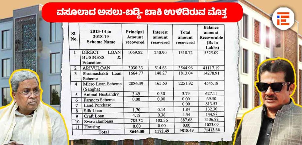 2013-14ರಿಂದ 2018-19ರವರೆಗೆ ಉದ್ಯಮ ಮತ್ತು ಶಿಕ್ಷಣಕ್ಕಾಗಿ 1,387 ಮಂದಿ 65.94 ಕೋಟಿ ಸಾಲ ಪಡೆದಿದ್ದರು. ಈ ಪೈಕಿ ಅಸಲು ಮೊತತ 10.69 ಕೋಟಿ ಮತ್ತು ಬಡ್ಡಿ ಮೊತ್ತವಾದ 2.40 ಕೋಟಿ ಸೇರಿ ಒಟ್ಟಾರೆ 13.10 ಕೋಟಿ ಮಾತ್ರ ವಸೂಲು ಮಾಡಿತ್ತು. ಬಾಕಿ 55.25 ಕೋಟಿ ವಸೂಲು ಮಾಡಿರಲಿಲ್ಲ.
