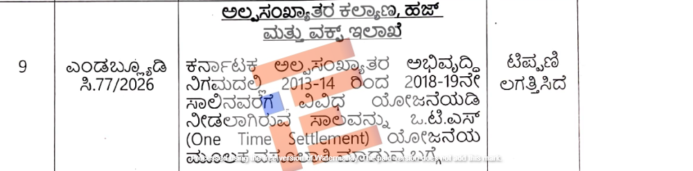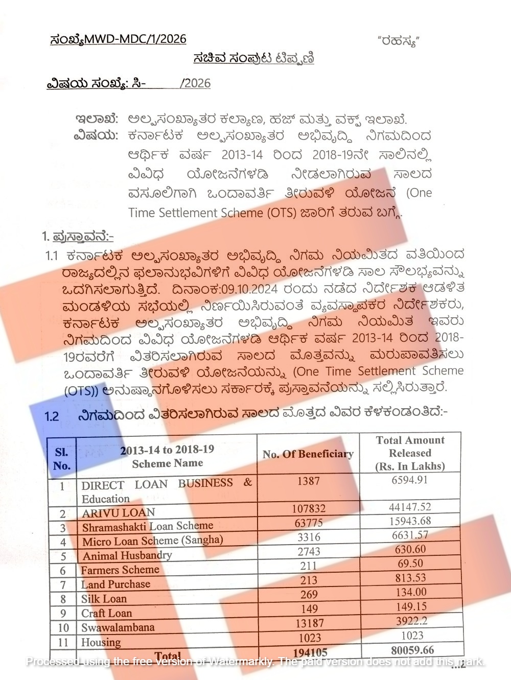 ವಿವಿಧ ಯೋಜನೆಗಳಲ್ಲಿ ಸಾಲ ಪಡೆದಿದ್ದ ಫಲಾನುಭವಿಗಳು ಪೂರ್ಣ ಪ್ರಮಾಣದಲ್ಲಿ ಸಾಲವನ್ನು ವಿತರಣೆ ಮಾಡಿರಲಿಲ್ಲ. ಹೀಗಾಗಿ ಫಲಾನುಭವಿಗಳು ಸಂಪೂರ್ಣ ಸಾಲದ ಮೊತ್ತವನ್ನು ಬಡ್ಡಿ ರಹಿತವಾಗಿ ಪಾವತಿಸಲು ಯೋಜನೆ ರೂಪಿಸಿದೆ. ಈ ಕುರಿತು ಅಲ್ಪಸಂಖ್ಯಾತರ ಅಭಿವೃದ್ಧಿ ನಿಗಮವು 2024ರ ಅಕ್ಟೋಬರ್ 9ರಂದು ಸಭೆ ನಡೆಸಿತ್ತು. ಈ ಸಭೆಯಲ್ಲಿ ನಿರ್ದೇಶಕ ಆಡಳಿತ ಮಂಡಳಿಯ ಸಭೆಯಲ್ಲಿ ಒಂದಾವರ್ತಿ ತೀರುವಳಿ ಯೋಜನೆ (ಒಟಿಎಸ್) ಯೋಜನೆಗೆ ಅನುಮೋದನೆ ದೊರತಿರುವುದು ಸಚಿವ ಸಂಪುಟದ ರಹಸ್ಯ ಹಾಳೆಗಳಿಂದ ಗೊತ್ತಾಗಿದೆ.
