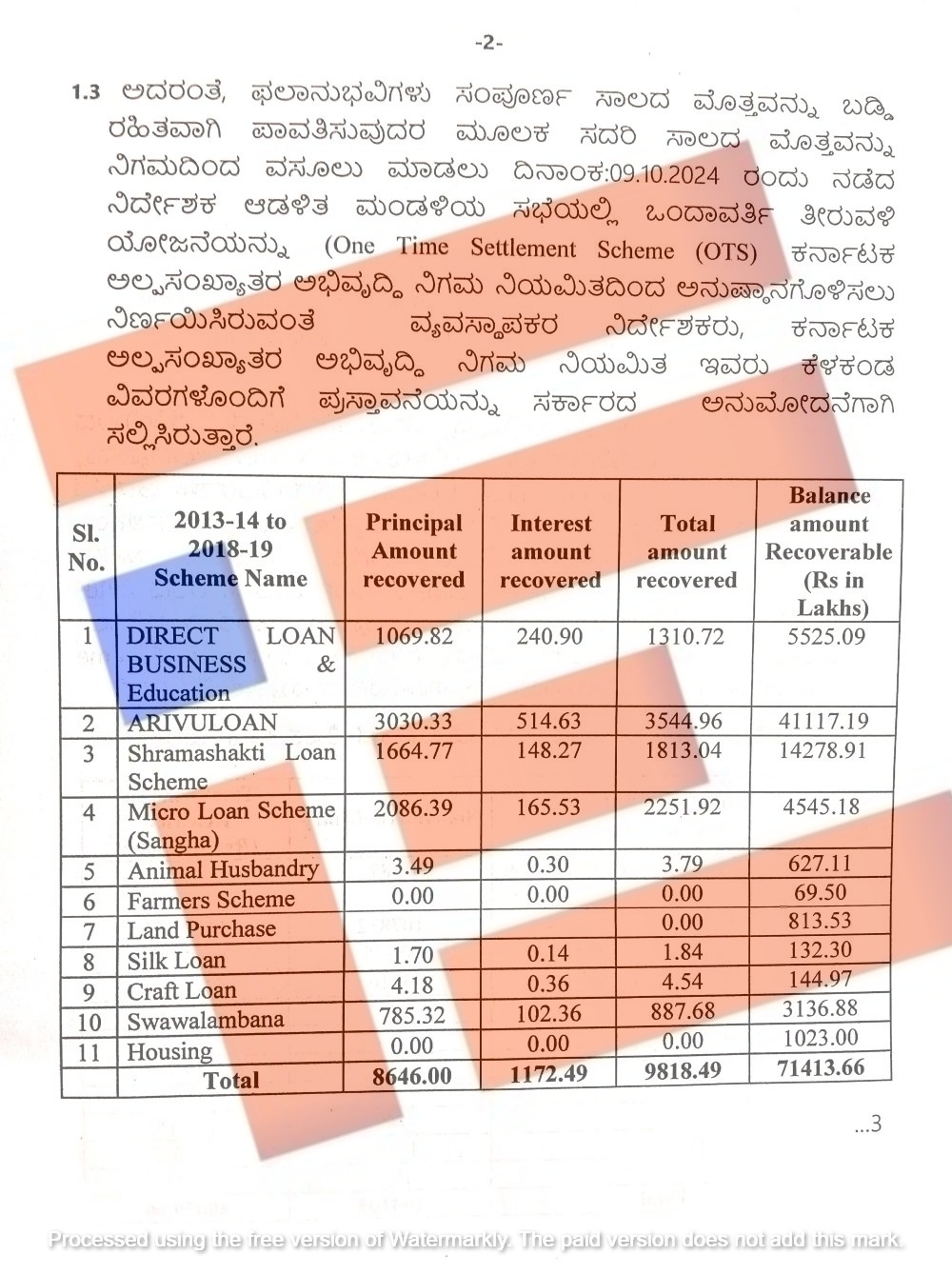 ಹೀಗಾಗಿ 1.94 ಲಕ್ಷ ಸಂಖ್ಯೆ ಫಲಾನುಭವಿಗಳು ಪಡೆದಿದ್ದ 800.59 ಕೋಟಿ ಸಾಲದ ಮೊತ್ತವನ್ನು ಮರುಪಾವತಿಸಲು ಒಂದಾವರ್ತಿ ತೀರುವಳಿ ಯೋಜನೆಯನ್ನು (ಒಟಿಎಸ್) ಅನುಷ್ಠಾನಗೊಳಿಸಲು ಸರ್ಕಾರಕ್ಕೆ ಇಲಾಖೆಯು ಪ್ರಸ್ತಾವಿಸಿರುವುದು ಸಚಿವ ಸಂಪುಟ ಟಿಪ್ಪಣಿ ಹಾಳೆಯಿಂದ ತಿಳಿದು ಬಂದಿದೆ.