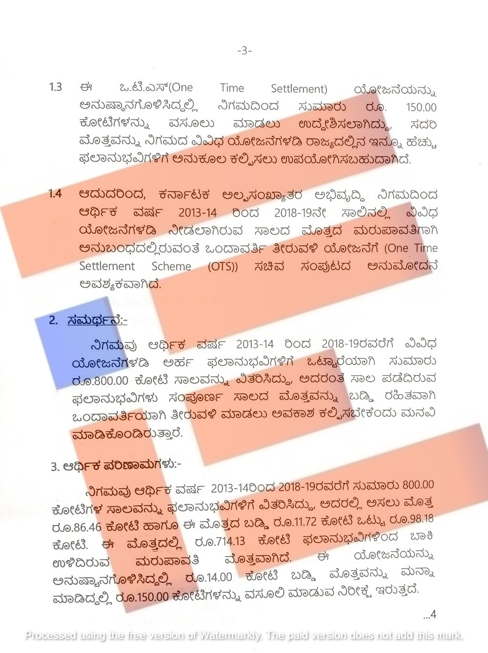 ಅಲ್ಲದೇ ಈ ಅವಧಿಯಲ್ಲಿ ವಿವಿಧ ಯೋಜನೆಗಳಡಿ ನೀಡಲಾಗಿರುವ ಸಾಲಕ್ಕೆ ಸಂಬಂಧಿಸಿದ ಬಡ್ಡಿ ಮನ್ನಾ ಮಾಡುವುದು ಪೂರ್ವ ನಿದರ್ಶನವಾಗಲಿದೆ. ಹೀಗಾಗಿ ಒಟಿಎಸ್ ಜಾರಿ ಮಾಡುವ ಮೊದಲು ಸಚಿವ ಸಂಪುಟಕ್ಕೆ ಪ್ರಸ್ತಾವ ಸಲ್ಲಿಸಬೇಕು ಎಂದು ಆರ್ಥಿಕ ಇಲಾಖೆಯು ತನ್ನ ಅಭಿಪ್ರಾಯದಲ್ಲಿ ಹೇಳಿತ್ತು.