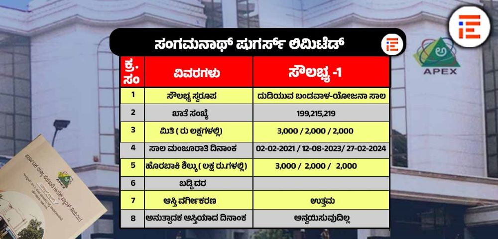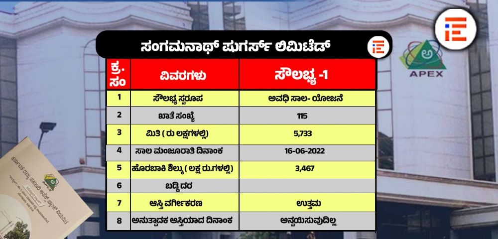 ಸಾಲ ಖಾತೆ 115ಕ್ಕೆ ಅಪೆಕ್ಸ್ ಬ್ಯಾಂಕ್ 2022ರ ಜೂನ್ 16ರಂದು 57.33 ಕೋಟಿ ರು ಗಳನ್ನು ಅವಧಿ ಸಾಲದ ರೂಪದಲ್ಲಿ ಮಂಜೂರು ಮಾಡಿತ್ತು.