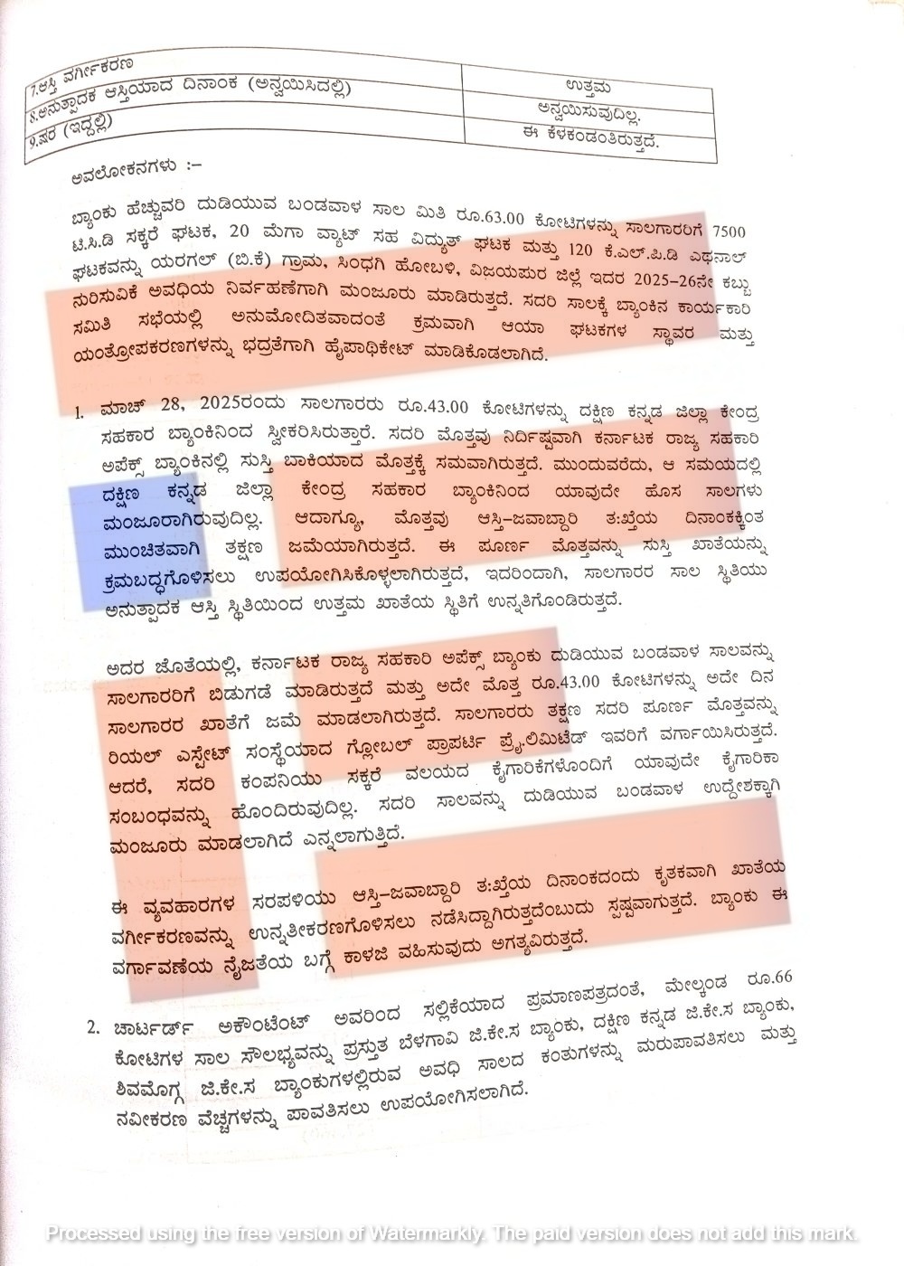 ಚಾರ್ಟರ್ಡ್ ಅಕೌಂಟೆಂಟ್ ರಿಂದ ಸಲ್ಲಿಕೆಯಾಗಿದ್ದ ಪ್ರಮಾಣ ಪತ್ರದ ಪ್ರಕಾರ 66 ಕೋಟಿ ರು.ಗಳ ಸಾಲ ಸೌಲಭ್ಯವನ್ನು ಬೆಳಗಾವಿ ಜಿಲ್ಲಾ ಕೇಂದ್ರ ಸಹಕಾರಿ ಬ್ಯಾಂಕ್, ದಕ್ಷಿಣ ಕನ್ನಡ ಮತ್ತು ಶಿವಮೊಗ್ಗ ಜಿಲ್ಲಾ ಕೇಂದ್ರ ಸಹಕಾರಿ ಬ್ಯಾಂಕ್ಗಳಲ್ಲಿರುವ ಅವಧಿ ಸಾಲದ ಕಂತುಗಳನ್ನು ಮರು ಪಾವತಿಸಲು ಮತ್ತು ನವೀಕರಣ ವೆಚ್ಚಗಳನ್ನು ಪಾವತಿಸಲು ಉಪಯೋಗಿಸಿತ್ತು. ‘ಆದುದರಿಂದ ಬ್ಯಾಂಕ್, ತಾನು ವಿತರಣೆ ಮಾಡಿದ ಸಾಲ ಯಾವ ಉದ್ದೇಶಕ್ಕಾಗಿ ಮಾಡಲಾಗಿದೆಯೋ ಅದೇ ಉದ್ದೇಶಕ್ಕೆ ಬಳಕೆಯಾಗಿದೆ ಎಂಬ ಬಗ್ಗೆ ಖಾತರಿಪಡಿಸಿಕೊಳ್ಳುವುದು ಸೂಕ್ತವಾಗಿದೆ,’ ಎಂದು ಲೆಕ್ಕ ಪರಿಶೋಧನ ವರದಿಯಲ್ಲಿ ಸಲಹೆ ನೀಡಲಾಗಿದೆ.