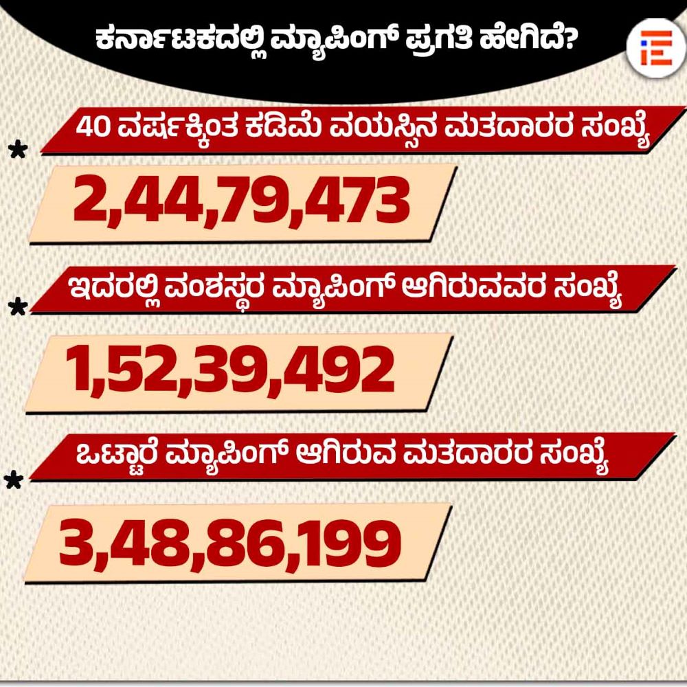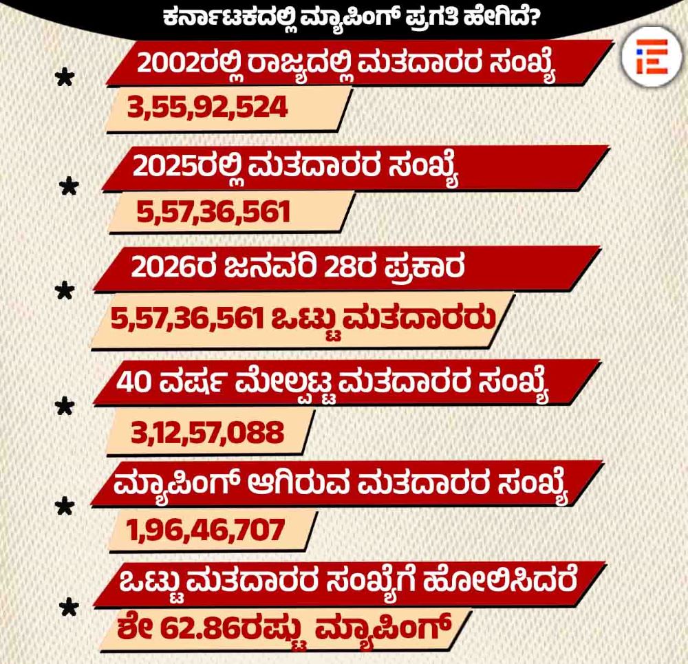 ಕರ್ನಾಟಕದಲ್ಲೂ ಎಸ್ಐಆರ್ ನಡೆಸಲು ಕೇಂದ್ರ ಸರ್ಕಾರವು ಶೀಘ್ರದಲ್ಲಿಯೇ ಆದೇಶ ಹೊರಡಿಸಲಿದೆ. ಹೀಗಾಗಿ ಭಾರತ ಚುನಾವಣೆ ಆಯೋಗದ ನಿರ್ದೇಶನದ ಪ್ರಕಾರ ಪೂರ್ವಭಾವಿಯಾಗಿ 2025ರ ಮತದಾರರ ಪಟ್ಟಿಯಲ್ಲಿನ ಮತದಾರರನ್ನು 2002ರ ಮತದಾರರ ಪಟ್ಟಿಯೊಂದಿಗೆ ಮ್ಯಾಪಿಂಗ್ ಮಾಡುವ ಕಾರ್ಯವು ಪ್ರಗತಿಯಲ್ಲಿದೆ ಎಂದು ವಿವರಿಸಿರುವುದು ಗೊತ್ತಾಗಿದೆ.