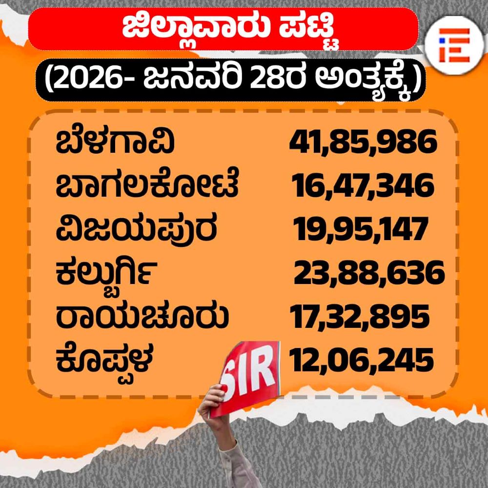 ಗದಗ್ನಲ್ಲಿ 9,05,649, ಧಾರವಾಡದಲ್ಲಿ 16,30, 595, ಉತ್ತರ ಕನ್ನಡದಲ್ಲಿ 12,29,149, ಹಾವೇರಿಯಲ್ಲಿ 13,53,427, ಬಳ್ಳಾರಿಯಲ್ಲಿ 12,48, 457, ಚಿತ್ರದುರ್ಗದಲ್ಲಿ 14,43,845,