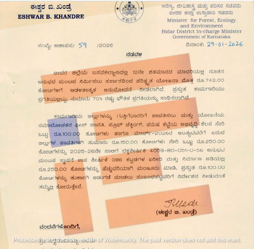 ಅಲ್ಲದೇ ಅನುಭವ ಮಂಟಪವು  2026ರ ಮೇ ಒಳಗೆ ಉದ್ಘಾಟನೆ ಆಗಬೇಕು ಎಂದು ಸಚಿವ ಈಶ್ವರ್ ಖಂಡ್ರೆ ಅವರೇ ಹೇಳಿಕೆ ನೀಡಿದ್ದರು. ಆದರೆ ಕಾಮಗಾರಿ ಪೂರ್ಣಗೊಳಿಸಲು ಗುತ್ತಿಗೆದಾರರಿಗೆ ಬಾಕಿ ಮೊತ್ತವೇ ಪಾವತಿಯಾಗುತ್ತಿಲ್ಲ. ಹೀಗಾಗಿ ಉದ್ಘಾಟನೆ ದಿನವನ್ನೂ ಮುಂದೂಡಬೇಕಾಗುತ್ತದೆ ಎಂದು ಗುತ್ತಿಗೆದಾರರು ಎಚ್ಚರಿಸಿದ್ದರು.  ಈ ಬೆಳವಣಿಗೆ ಬೆನ್ನಲ್ಲೇ ಸಚಿವ ಈಶ್ವರ್ ಖಂಡ್ರೆ ಅವರು 2026ರ ಜನವರಿ 29ರಂದು ಮುಖ್ಯಮಂತ್ರಿಗೆ ಬರೆದಿರುವ ಪತ್ರವು ಮುನ್ನೆಲೆಗೆ ಬಂದಿದೆ. ಈ ಪತ್ರದ ಪ್ರತಿಯು ‘ದಿ ಫೈಲ್’ಗೆ ಲಭ್ಯವಾಗಿದೆ.