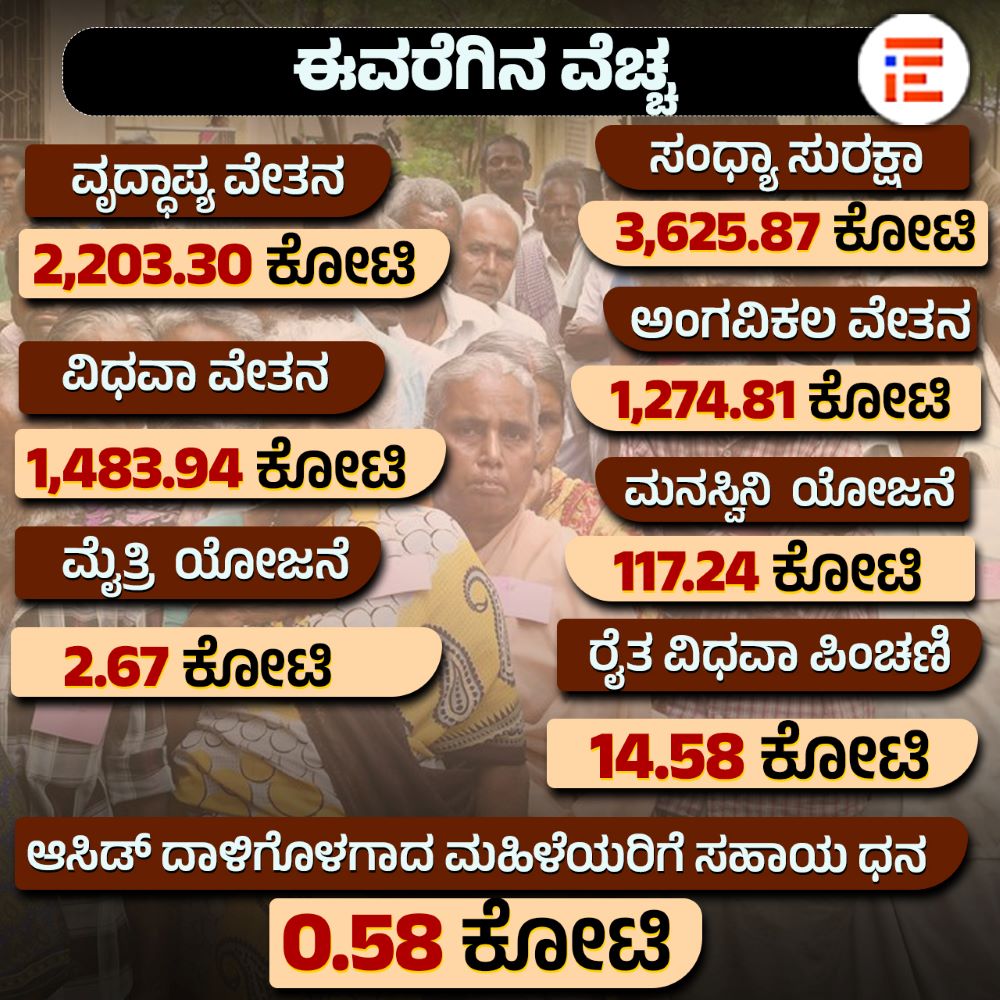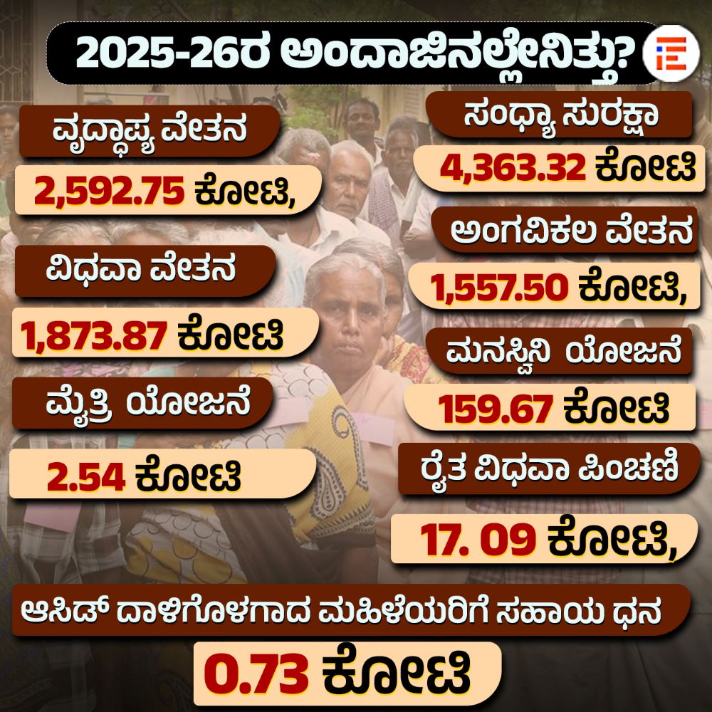 ಬೆಂಗಳೂರು; 2025-26ನೇ ಸಾಲಿಗೆ ಸಂಬಂಧಿಸಿದಂತೆ  ವೃದ್ಧಾಪ್ಯ,  ಸಂಧ್ಯಾ ಸುರಕ್ಷಾ, ವಿಧವಾ, ಅಂಗವಿಕಲ,  ಸೇರಿದಂತೆ 12 ಸಾಮಾಜಿಕ ಭದ್ರತಾ ಯೋಜನೆಗಳಡಿಯಲ್ಲಿ ಫಲಾನುಭವಿಗಳಿಗೆ ವಿತರಿಸಲು ಆಯವ್ಯಯ ಅಂದಾಜಿನ ಪೈಕಿ ಇನ್ನೂ 1,898.92 ಕೋಟಿ ರುಪಾಯಿ ಇನ್ನೂ ವೆಚ್ಚವಾಗಿಲ್ಲ.