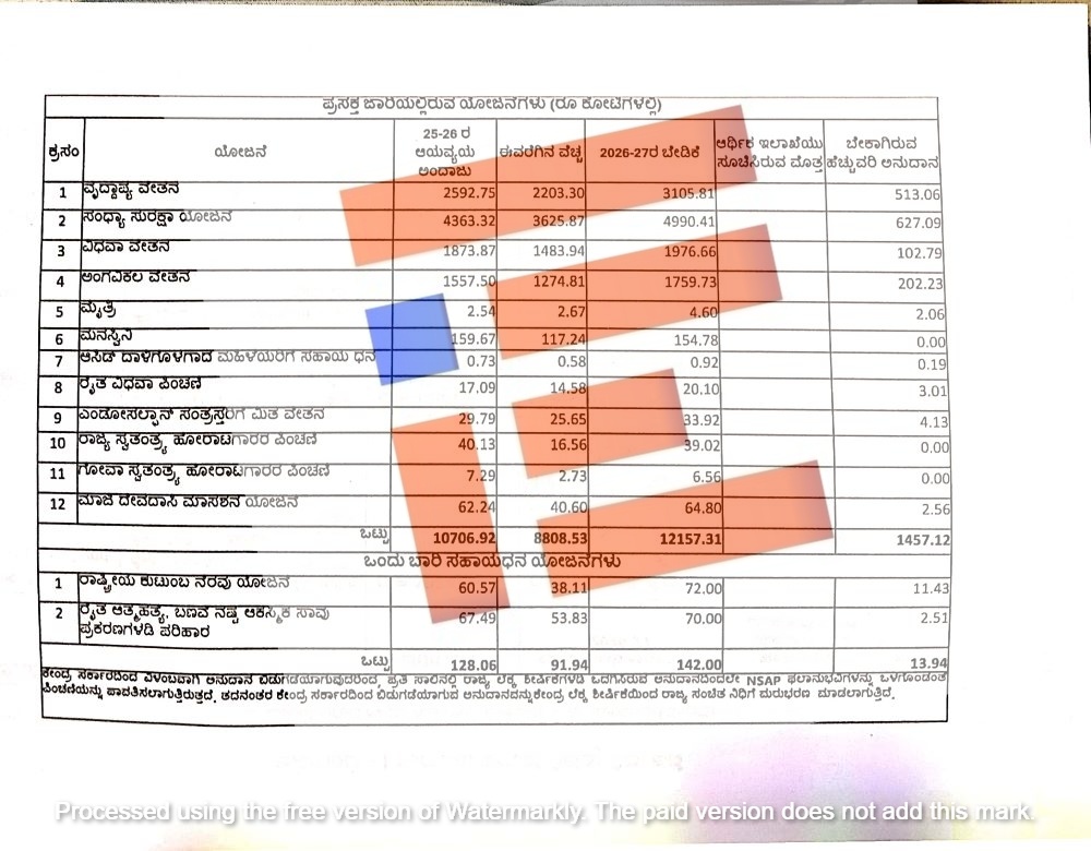 2026-27ನೇ ಸಾಲಿಗೆ ಇವೇ 12 ಸಾಮಾಜಿಕ ಭದ್ರತೆ ಯೋಜನೆಗಳಿಗೆ 12,157.31 ಕೋಟಿ ರುಪಾಯಿ ಬೇಡಿಕೆಯನ್ನು ಇರಿಸಿದೆ. ಕಳೆದ ವರ್ಷಕ್ಕೆ ಹೋಲಿಸಿದರೇ 20262-27ನೇ ಸಾಲಿಗೆ 1,457.12 ಕೋಟಿಯಷ್ಟು ಹೆಚ್ಚುವರಿ ಅನುದಾನ ಕೋರಿರುವುದು ಪ್ರಾತ್ಯಕ್ಷಿಕೆಯಿಂದ  ತಿಳಿದು ಬಂದಿದೆ.