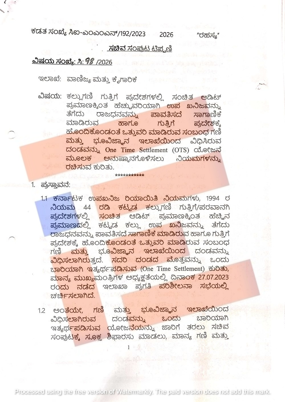 ಒಟಿಎಸ್ ಯೋಜನೆ ಅನುಷ್ಠಾನದ ಕುರಿತು ತಿದ್ದುಪಡಿ ಮಾಡಲು ಸಿದ್ಧಪಡಿಸಿರುವ ಕರಡು ನಿಯಮಾವಳಿಗಳು ಕಲ್ಲು ಗಣಿ ಗುತ್ತಿಗೆ ಪ್ರದೇಶಗಳಲ್ಲಿ ಸಂಚಿತ ಆಡಿಟ್ ಪ್ರಮಾಣಕ್ಕಿಂತ ಹೆಚ್ಚುವರಿಯಾಗಿ ಉಪ ಖನಿಜವನ್ನು ತೆಗೆದು ರಾಜಧನವನ್ನು ಪಾವತಿಸದೇ ಸಾಗಾಣಿಕೆ ಮಾಡಿರುವ ಮತ್ತು ಗುತ್ತಿಗೆ ಪ್ರದೇಶಕ್ಕೆ ಹೊಂದಿಕೊಂಡಂತೆ ಒತ್ತುವರಿ ಮಾಡಿರುವ ಸಂಬಂಧ ಗಣಿ ಭೂ ವಿಜ್ಞಾನ ಇಲಾಖೆಯಿಂದ ವಿಧಿಸಿರುವ ದಂಡವನ್ನು ಒಟಿಎಸ್ ಯೋಜನೆ ಮೂಲಕ ಪಾವತಿಸಲು ಅವಕಾಶ ಕಲ್ಪಿಸಲು ಕಾನೂನು ಇಲಾಖೆಯು ಸಹಮತಿಸಿರುವುದು ಟಿಪ್ಪಣಿ ಹಾಳೆಯಿಂದ ಗೊತ್ತಾಗಿದೆ.