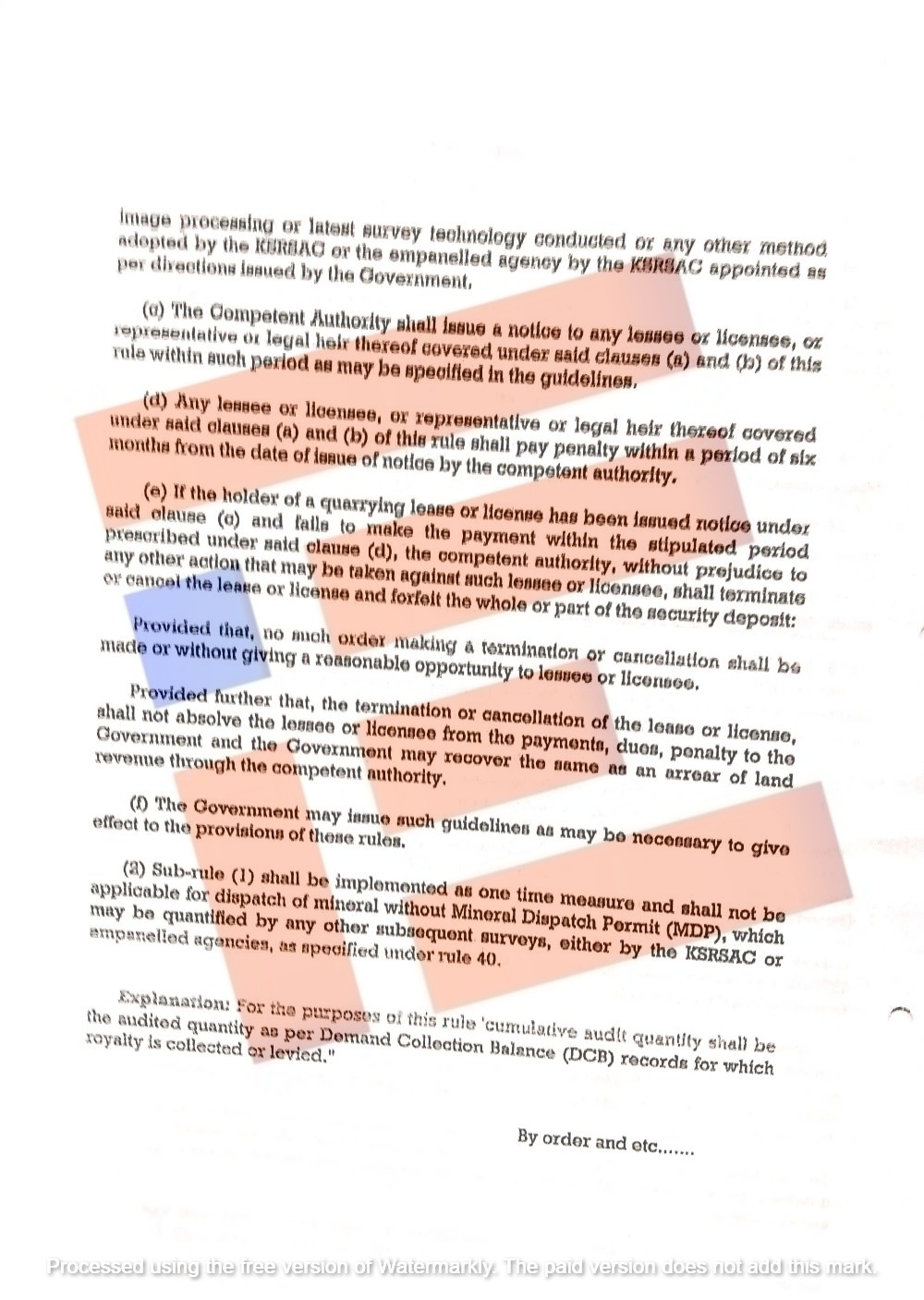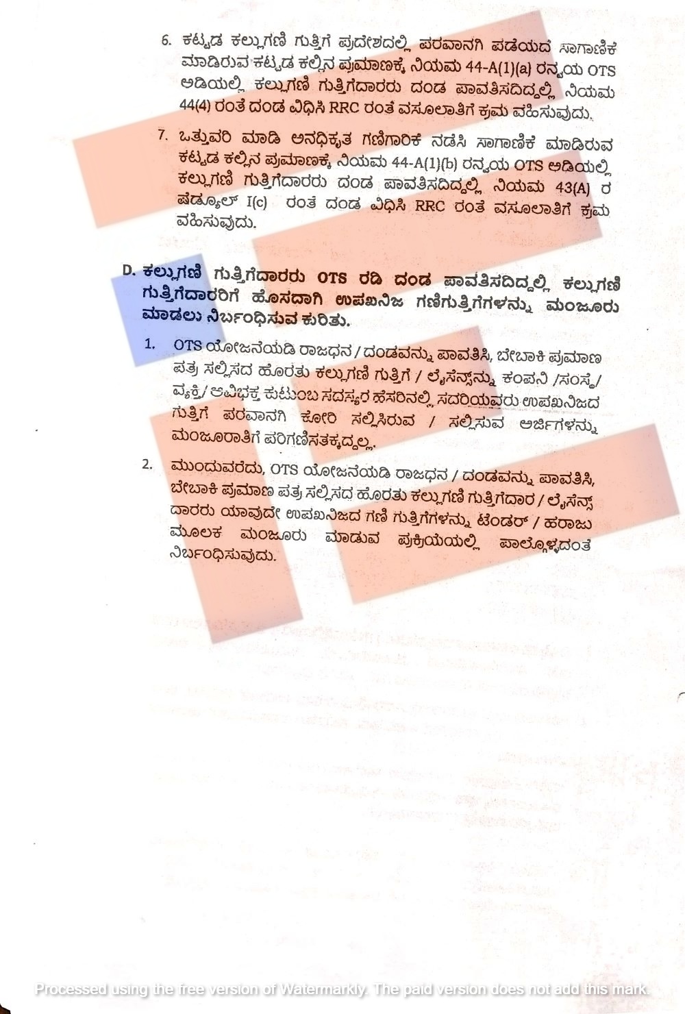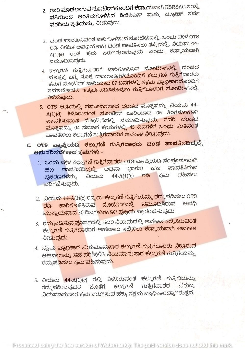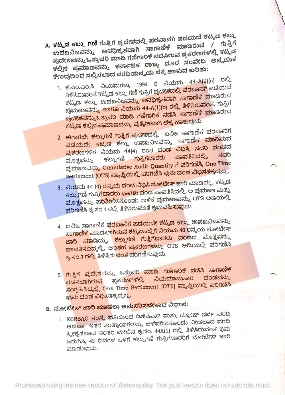 ನಿಯಮ 44(4) ಅನ್ವಯ ದಂಡ ವಿಧಿಸಿ ನೋಟೀಸ್ ಜಾರಿ ಮಾಡಿದ್ದು ಕಟ್ಟಡ ಕಲ್ಲುಗಣಿ ಗುತ್ತಿಗೆದಾರರು ಭಾಗಶಃ ದಂಡ ಪಾವತಿಸಿದಲ್ಲಿ ಆ ಪ್ರಮಾಣ ಮತ್ತು ಮೊತ್ತವನ್ನು ಪರಿಶೀಲಿಸಿಕೊಂಡು ಉಳಿಕೆ ಪ್ರಮಾಣವನ್ನು ಒಟಿಎಸ್ ಅಡಿಯಲ್ಲಿ ಪರಿಗಣಿಸಿ ಕ್ರಮ ವಹಿಸಬೇಕು ಎಂದು ಸೂಚಿಸಿದೆ.