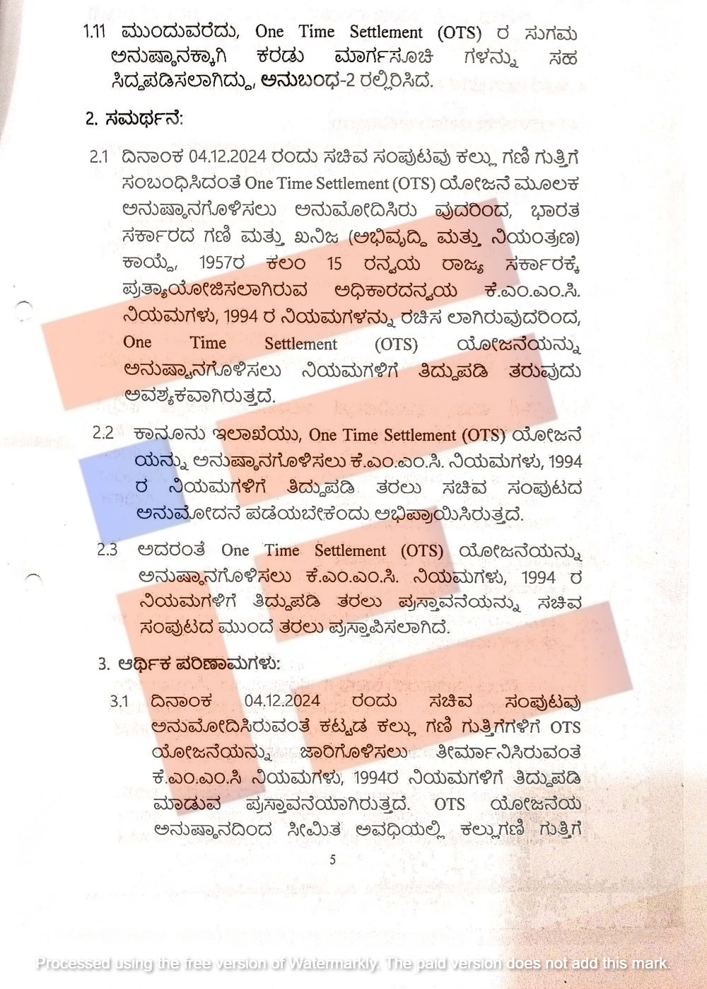 ಗಣಿ ಭೂ ವಿಜ್ಞಾನ ಇಲಾಖೆಯಿಂದ ವಿಧಿಸಿರುವ ದಂಡವನ್ನು ಒಟಿಎಸ್ ಮೂಲಕ ಅನುಷ್ಠಾನಗೊಳಿಸಿರುವ ಕುರಿತು ಶಿಫಾರಸ್ಸುಗಳನ್ನು ಮಾಡಲು ರಚಿತವಾಗಿರುವ ಸಚಿವ ಸಂಪುಟ ಉಪ ಸಮಿತಿಯ ಶಿಫಾರಸ್ಸುಗಳ ಮೇಲೆ ಸಚಿವ ಸಂಪುಟವು ಕೈಗೊಳ್ಳುವ ತೀರ್ಮಾನದ ಹಿನ್ನೆಲೆಯಲ್ಲಿ ಆರ್ಥಿಕ ಪರಿಣಾಮಗಳನ್ನು ನಿರೀಕ್ಷಿಸಿದೆ,’ ಎಂದು ಅಭಿಪ್ರಾಯಿಸಿತ್ತು.