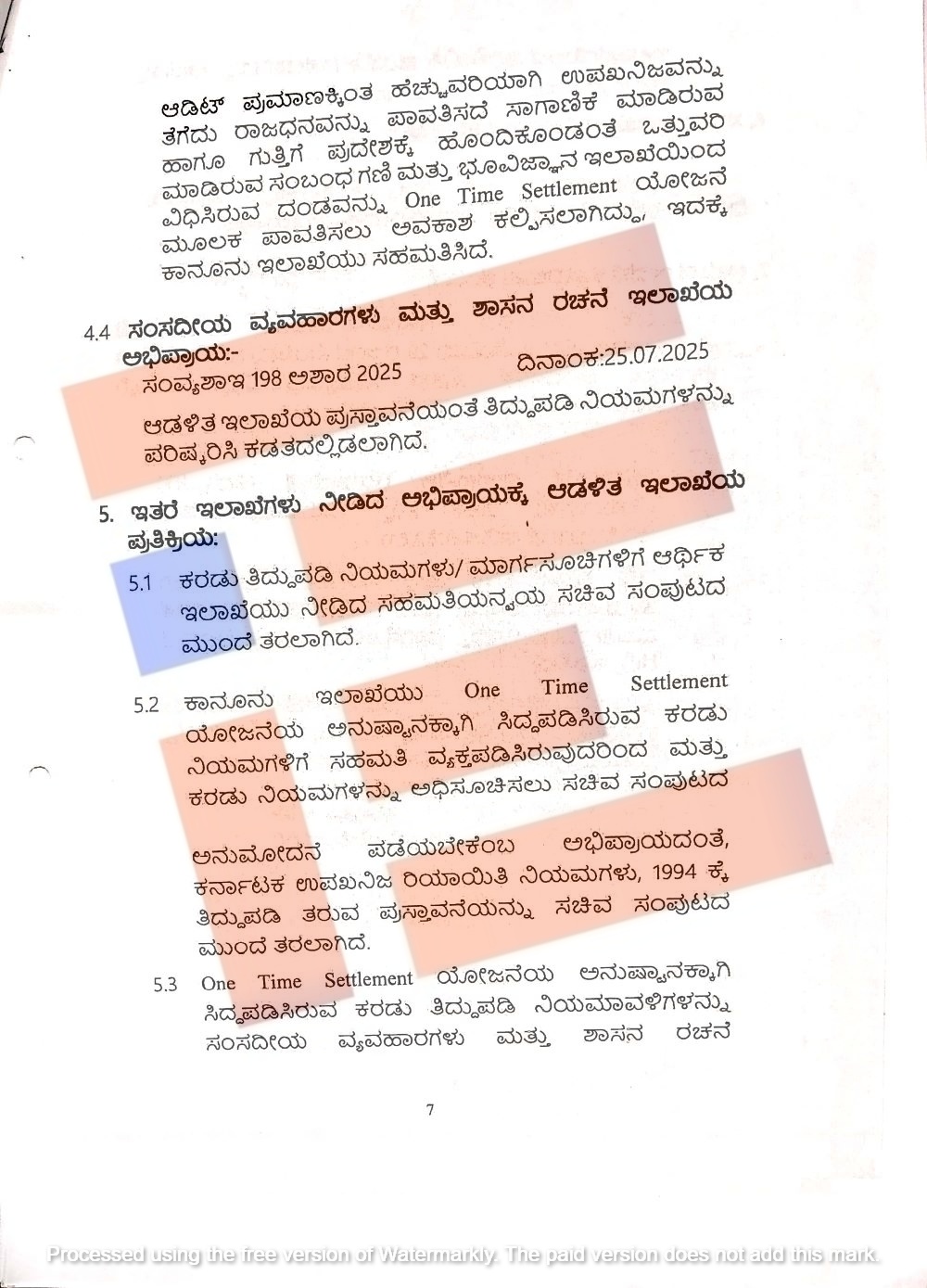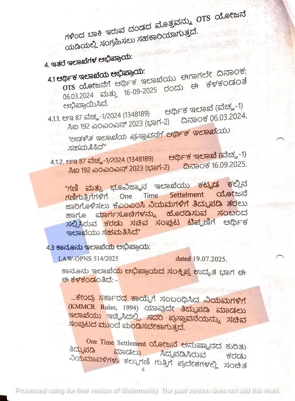 ಒಂದಾವರ್ತಿ ತೀರುವಳಿ (ಒಟಿಎಸ್) ಮೂಲಕ ಅನುಷ್ಠಾನಗೊಳಿಸಲು ನಿಯಮ ರಚಿಸಲು ಕೈಗಾರಿಕೆ ಮತ್ತು ವಾಣಿಜ್ಯ ಇಲಾಖೆ ಸಲ್ಲಿಸಿದ್ದ ಪ್ರಸ್ತಾವವನ್ನು ಕಾನೂನು ಇಲಾಖೆಯು ಪರಿಶೀಲಿಸಿತ್ತು. ಕೇಂದ್ರ ಸರ್ಕಾರದ ಕಾಯ್ದೆಗೆ ಸಂಬಂಧಿಸಿದ ನಿಯಮಗಳಿಗೆ (ಕೆಎಂಎಂಸಿಆರ್ ನಿಯಮ 1994) ಯಾವುದೇ ತಿದ್ದುಪಡಿ ಮಾಡಲು ಇಲಾಖೆಯು ಇಚ್ಛಿಸಿದಲ್ಲಿ ಈ ಪ್ರಸ್ತಾವನೆಯನ್ನು ಸಚಿವ ಸಂಪುಟದ ಮುಂದೆ ಮಂಡಿಸಬೇಕಾಗುತ್ತದೆ.