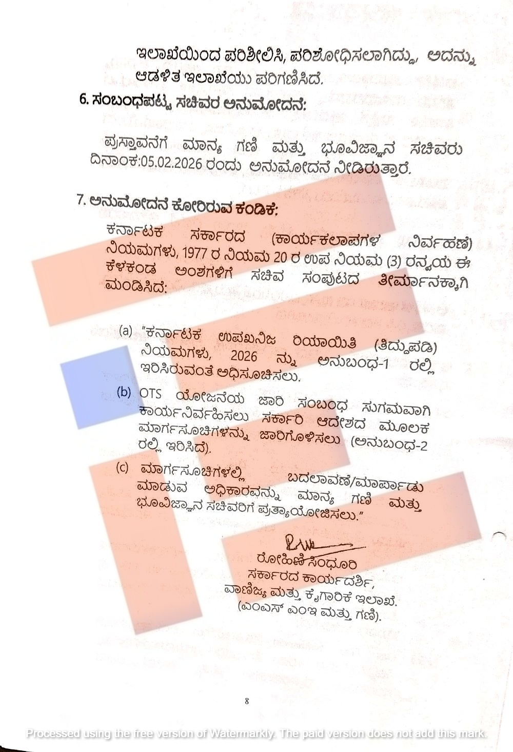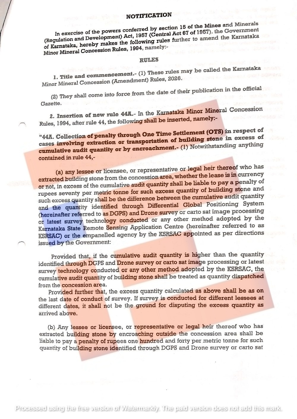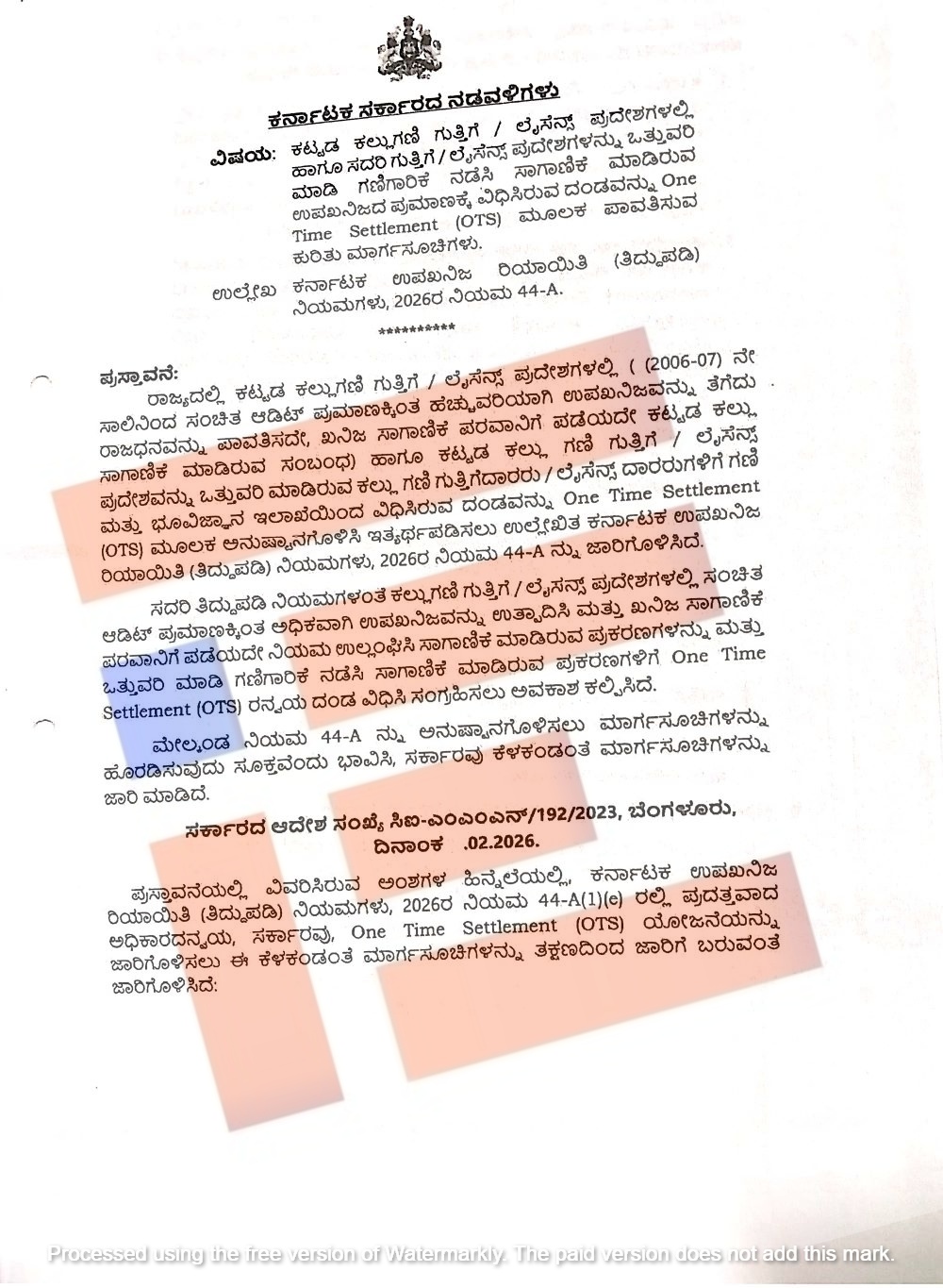 ಗಣಿ ಮತ್ತು ಭೂ ವಿಜ್ಞಾನ ಇಲಾಖೆಯಿಂಧ ವಿಧಿಸಿರುವ ದಂಡವನ್ನು ಒಟಿಎಸ್ ಮೂಲಕ ಅನುಷ್ಠಾನಗೊಳಿಸಿ ಮತ್ತು ಇತ್ಯರ್ಥಪಡಿಸಲು ಕರ್ನಾಟಕ ಉಪ ಖನಿಜ ರಿಯಾಯಿತಿ (ತಿದ್ದುಪಡಿ) ನಿಯಮಗಳು 2026 ನಿಯಮ 44-ಎ ಜಾರಿಗೊಳಿಸಲಿದೆ. ಈ ನಿಯಮಗಳ ಮಾರ್ಗಸೂಚಿಗಳನ್ನೂ ಸಹ ಶೀಘ್ರದಲ್ಲಿಯೇ ಹೊರಡಿಸಲಿದೆ.