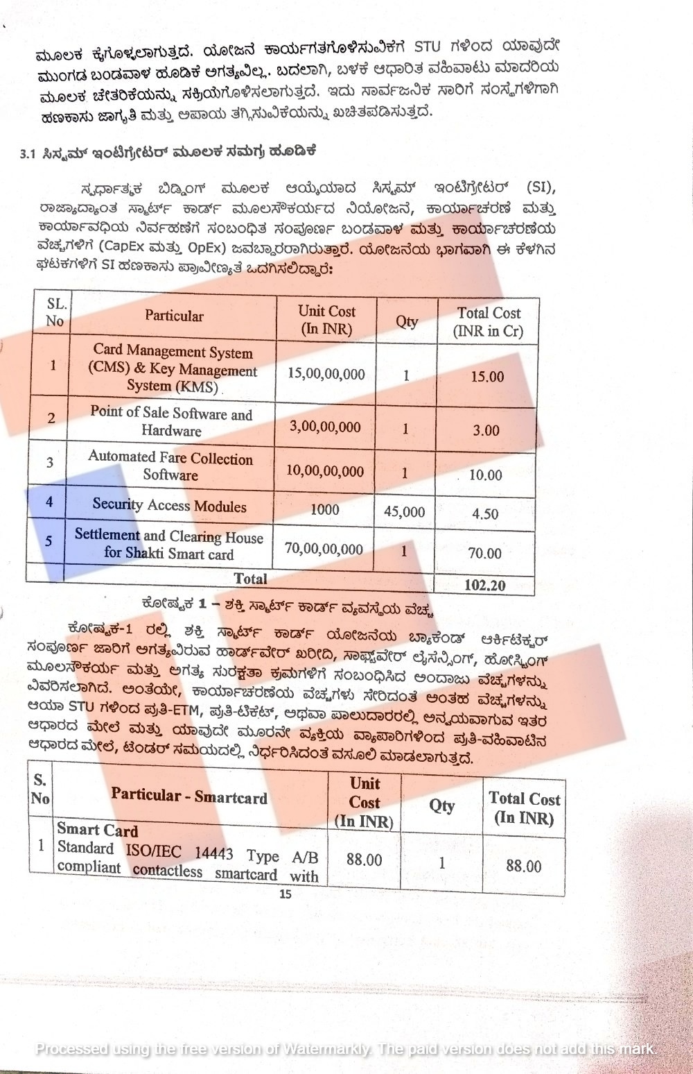 ಸ್ಪರ್ಧಾತ್ಮಕ ಬಿಡ್ಡಿಂಗ್ ಮೂಲಕ ಆಯ್ಕೆಯಾದ ಸಿಸ್ಟಂ ಇಂಟ್ರಿಗ್ರೇಟರ್ ರಾಜ್ಯಾದ್ಯಂತ ಸ್ಮಾರ್ಟ್‌ ಕಾರ್ಡ್‌ ಮೂಲಸೌಕರ್ಯದ ನಿಯೋಜನೆ, ಕಾರ್ಯಾಚರಣೆ ಮತ್ತು ಕಾರ್ಯಾವಧಿಯ ನಿರ್ವಹಣೆಗೆ ಸಂಬಂಧಿತ ಸಂಪೂರ್ಣ ಬಂಡವಾಳ ಮತ್ತು ಕಾರ್ಯಾಚರಣೆಯ ವೆಚ್ಚವನ್ನು ಸಚಿವ ಸಂಪುಟಕ್ಕೆ ಒದಗಿಸಿದೆ.