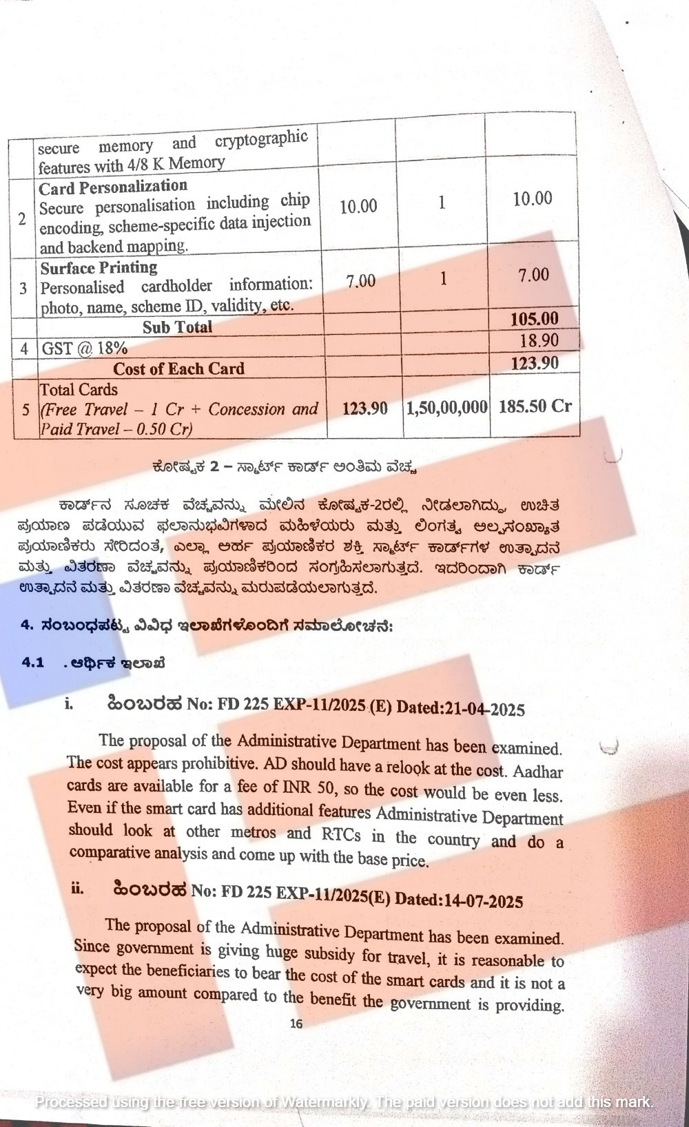 ಆಡಳಿತ ಇಲಾಖೆಯ ಪ್ರಸ್ತಾವನೆಯನ್ನು ಪರಿಶೀಲಿಸಲಾಗಿದೆ. ವೆಚ್ಚವು ದುಬಾರಿಯಾಗಿದೆ. ಆಡಳಿತ ಇಲಾಖೆಯು ವೆಚ್ಚವನ್ನು ಪುನರ್ ಪರಿಶೀಲಿಸಬೇಕು.  ಆಧಾರ್ ಕಾರ್ಡ್‌ಗಳು 50 ರೂಪಾಯಿ ಶುಲ್ಕಕ್ಕೆ ಲಭ್ಯವಿದೆ. ಸ್ಮಾರ್ಟ್ ಕಾರ್ಡ್‌ಗೆ ವಿಧಿಸಿರುವ ಶುಲ್ಕಕ್ಕಿಂತಲೂ  ಕಡಿಮೆ ಇದೆ. ಸ್ಮಾರ್ಟ್ ಕಾರ್ಡ್ ಹೆಚ್ಚುವರಿ ವೈಶಿಷ್ಟ್ಯಗಳನ್ನು ಹೊಂದಿದ್ದರೂ ಸಹ, ಆಡಳಿತ ಇಲಾಖೆಯು ದೇಶದ ಇತರ ಮಹಾನಗರಗಳು ಮತ್ತು ರಸ್ತೆ ಸಾರಿಗೆ ಸಂಸ್ಥೆಗಳ ದರಗಳನ್ನು ನೋಡಬೇಕು.  ಮತ್ತು ತುಲನಾತ್ಮಕ ವಿಶ್ಲೇಷಣೆ ಮಾಡಿ ಮೂಲ ಬೆಲೆಯನ್ನು ನಿಗದಿಪಡಿಸಬೇಕು ಎಂದು ಸಾರಿಗೆ ಇಲಾಖೆಗೆ ಸೂಚಿಸಿತ್ತು.