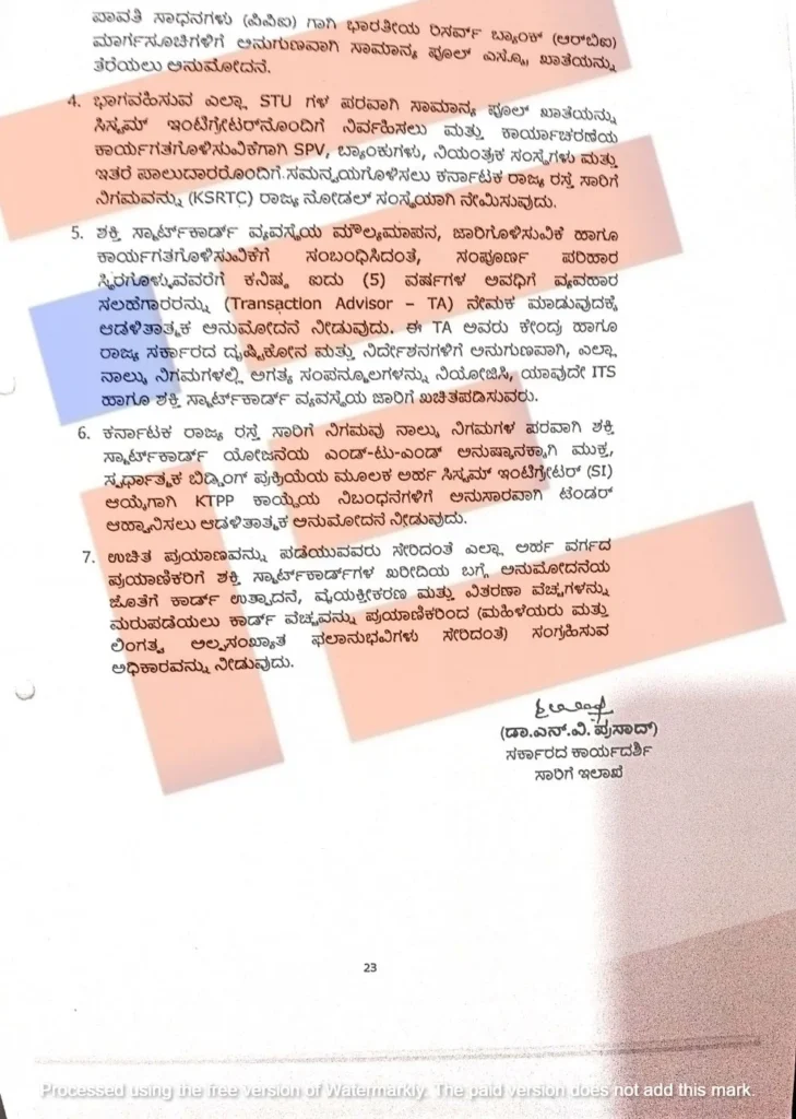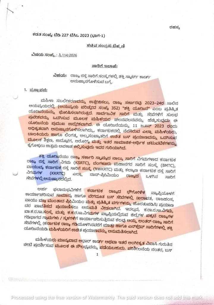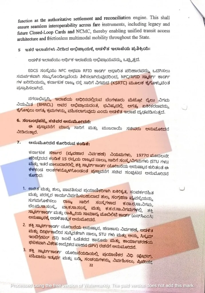 ಉಚಿತ ಮತ್ತು ಶುಲ್ಕ ಪಾವತಿಸುವ ಪ್ರಯಾಣಿಕರಿಗಾಗಿ ಏಕೀಕೃತ, ಸಂಪರ್ಕರಹಿತ ಮತ್ತು ಪರಸ್ಪರ ಕಾರ್ಯನಿರ್ವಹಿಸಬಹುದಾದ ಶುಲ್ಕ ಸಂಗ್ರಹಣೆ ವ್ಯವಸ್ಥೆಯನ್ನು ಸುಗಮಗೊಳಿಸಲು ಕರ್ನಾಟಕ ರಾಜ್ಯ ರಸ್ತೆ ಸಾರಿಗೆ ನಿಗಮ, ಬೆಂಗಳೂರು ಮಹಾನಗರ ಸಾರಿಗೆ, ವಾಯುವ್ಯ, ಕಲ್ಯಾಣ ಕರ್ನಾಟಕ ಸಾರಿಗೆ ನಿಗಮಗಳಲ್ಲಿ ಶಕ್ತಿ ಸ್ಮಾರ್ಟ್ ಕಾರ್ಡ್ ಮತ್ತು ರಾಷ್ಟ್ರೀಯ ಸಾಮಾನ್ಯ ಮೊಬಿಲಿಸಿ (ಎನ್ಸಿಎಂಸಿ) ಅನುಷ್ಠಾನಕ್ಕೆ ಆಡಳಿತಾತ್ಮಕ ಅನುಮೋದನೆ ಕೋರಿತ್ತು.