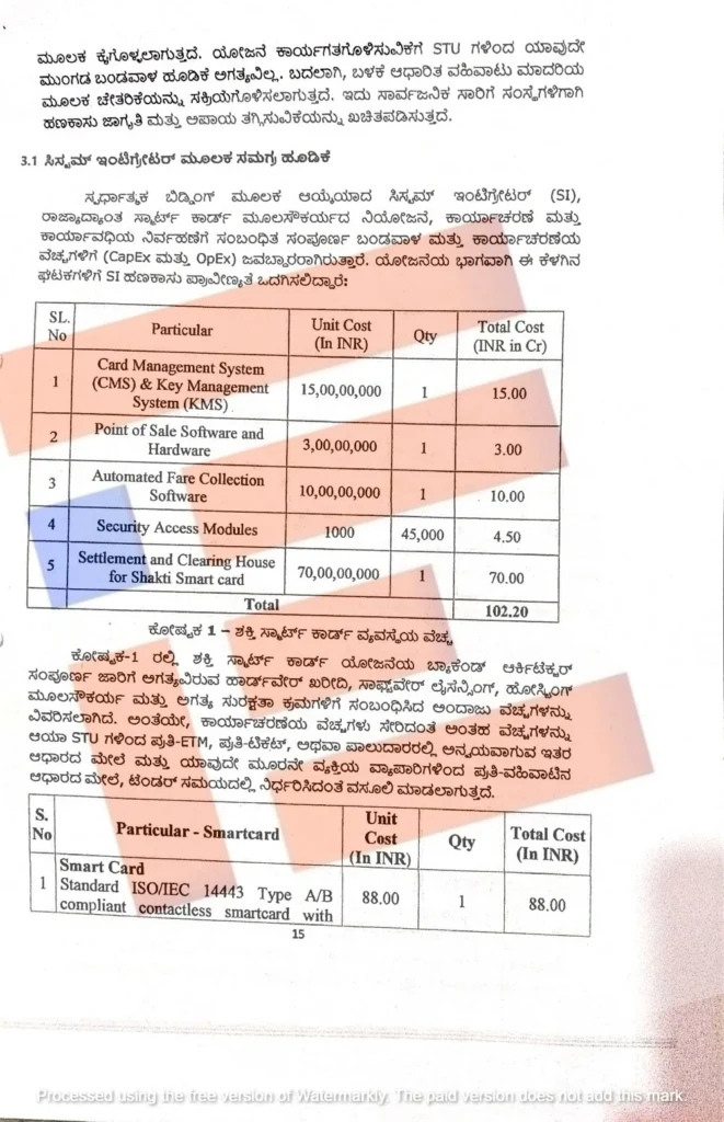 ಇದರ ಪ್ರಕಾರ ಕಾರ್ಡ್ ಮ್ಯಾನೇಜ್ಮೆಂಟ್ ಸಿಸ್ಟಂ (ಸಿಎಂಎಸ್)ಗೆ 15 ಕೋಟಿ, ಸಾಫ್ಟ್ವೇರ್ ಮತ್ತು ಹಾರ್ಡ್ವೇರ್ಗೆ 3 ಕೋಟಿ,ಸ್ವಯಂಚಾಲಿತ ಶುಲ್ಕ ಸಂಗ್ರಹ ಸಾಫ್ಟ್ವೇರ್ಗೆ 10 ಕೋಟಿ, ಕಾರ್ಡ್ಗೆ ಸೆಕ್ಯುರಿಟಿ ಆಕ್ಸೆಸ್ ಮಾಡ್ಯುಲ್ಗೆ 4.50 ಕೋಟಿ, ಸೆಟಲ್ಮೆಂಟ್ ಅಂಡ್ ಕ್ಲಿಯರಿಂಗ್ ಹೌಸ್ ಫಾರ್ ಶಕ್ತಿ ಸ್ಮಾರ್ಟ್ ಕಾರ್ಡ್ ಸೌಲಭ್ಯಕ್ಕೆ 70 ಕೋಟಿ ಸೇರಿ ಒಟ್ಟಾರೆ 102.50 ಕೋಟಿ ವೆಚ್ಚವಾಗಲಿದೆ ಎಂದು ಅಂದಾಜಿಸಿದೆ.