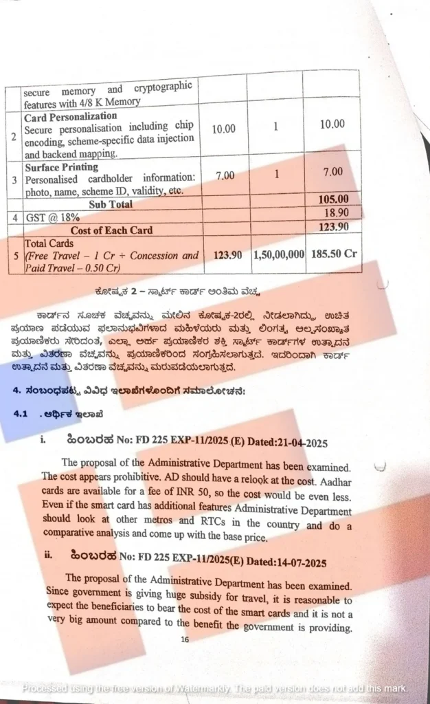 ಸರ್ಕಾರ ಉಚಿತ ಪ್ರಯಾಣಕ್ಕಾಗಿ ಭಾರಿ ಸಬ್ಸಿಡಿ ನೀಡುತ್ತಿದೆ. ಸ್ಮಾರ್ಟ್ ಕಾರ್ಡ್ಗಳ ವೆಚ್ಚವನ್ನು ಫಲಾನುಭವಿಗಳೇ ಭರಿಸುತ್ತಾರೆಂದು ನಿರೀಕ್ಷಿಸುವುದು ಸಮಂಜಸವಾಗಿದೆ. ಮತ್ತು ಸರ್ಕಾರ ಒದಗಿಸುತ್ತಿರುವ ಪ್ರಯೋಜನಕ್ಕೆ ಹೋಲಿಸಿದರೆ ಇದು ತುಂಬಾ ದೊಡ್ಡ ಮೊತ್ತವಲ್ಲ. ಆದ್ದರಿಂದ ಸ್ಮಾರ್ಟ್ ಕಾರ್ಡ್ಗಳ ವೆಚ್ಚವನ್ನು ಫಲಾನುಭವಿಗಳಿಗೆ ಬಿಲ್ ಮಾಡಬೇಕೆಂಬ ಷರತ್ತಿನೊಂದಿಗೆ ಸಮ್ಮತಿಸುತ್ತದೆ ಎಂದು ಹೇಳಿರುವುದು ತಿಳಿದು ಬಂದಿದೆ.