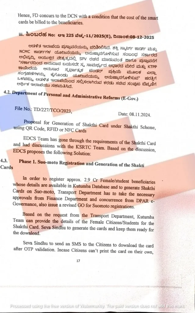 ಉಚಿತ ಪ್ರಯಾಣವನ್ನು ಪಡೆಯುವರು ಸೇರಿದಂತೆ ಎಲ್ಲಾ ಅರ್ಹ ವರ್ಗದ ಪ್ರಯಾಣಿಕರಿಗೆ ಶಕ್ತಿ ಸ್ಮಾರ್ಟ್ ಕಾರ್ಡ್ಗಳ ಖರೀದಿಯ ಬಗ್ಗೆ ಅನುಮೋದನೆಯ ಜೊತೆಗೆ ಕಾರ್ಡ್ ಉತ್ಪಾದನೆ, ವೈಯಕ್ತೀಕರಣ ಮತ್ತು ವಿತರಣೆ ವೆಚ್ಚಗಳನ್ನು ಮರುಪಡೆಯಲು ಕಾರ್ಡ್ ವೆಚ್ಚವನ್ನು ಪ್ರಯಾಣಿಕರಿಂದ (ಮಹಿಳೆಯರು ಮತ್ತು ಲಿಂಗತ್ವ ಅಲ್ಪಸಂಖ್ಯಾತ ಫಲಾನುಭವಿಗಳು ಸೇರಿದಂತೆ) ಸಂಗ್ರಹಿಸಲು ಅಧಿಕಾರ ನೀಡಬೇಕು ಎಂದು ಸಾರಿಗೆ ಇಲಾಖೆಯ ಸರ್ಕಾರದ ಕಾರ್ಯದರ್ಶಿ ಡಾ ಎನ್ ವಿ ಪ್ರಸಾದ್ ಅವರು ಕೋರಿದ್ದರು.