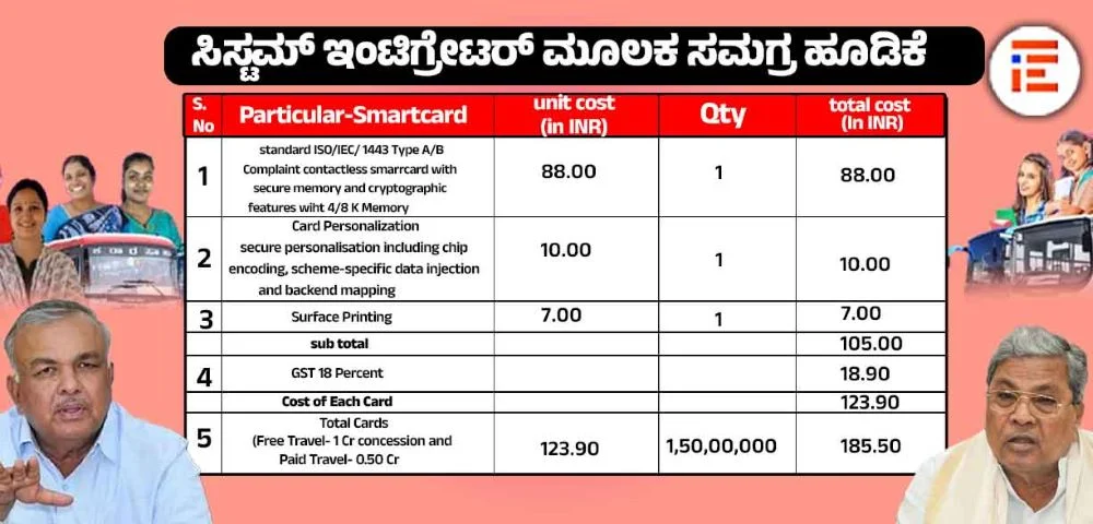 ಇದರ ಪ್ರಕಾರ ಶಕ್ತಿ ಸ್ಮಾರ್ಟ್ ಕಾರ್ಡ್ ವ್ಯವಸ್ಥೆಯ ಒಟ್ಟಾರೆ ವೆಚ್ಚವು ಉಚಿತ ಪ್ರಯಾಣದ 1 ಕೋಟಿ ಮತ್ತು ಶುಲ್ಕ ಪಾವತಿಸಿ ಪ್ರಯಾಣ ಬೆಳೆಸುವ 0.50 ಕೋಟಿ ಪ್ರಯಾಣಿಕರಿಗೆ ಒಟ್ಟಾರೆ 185.50 ಕೋಟಿ ರು ಆಗಲಿದೆ.
