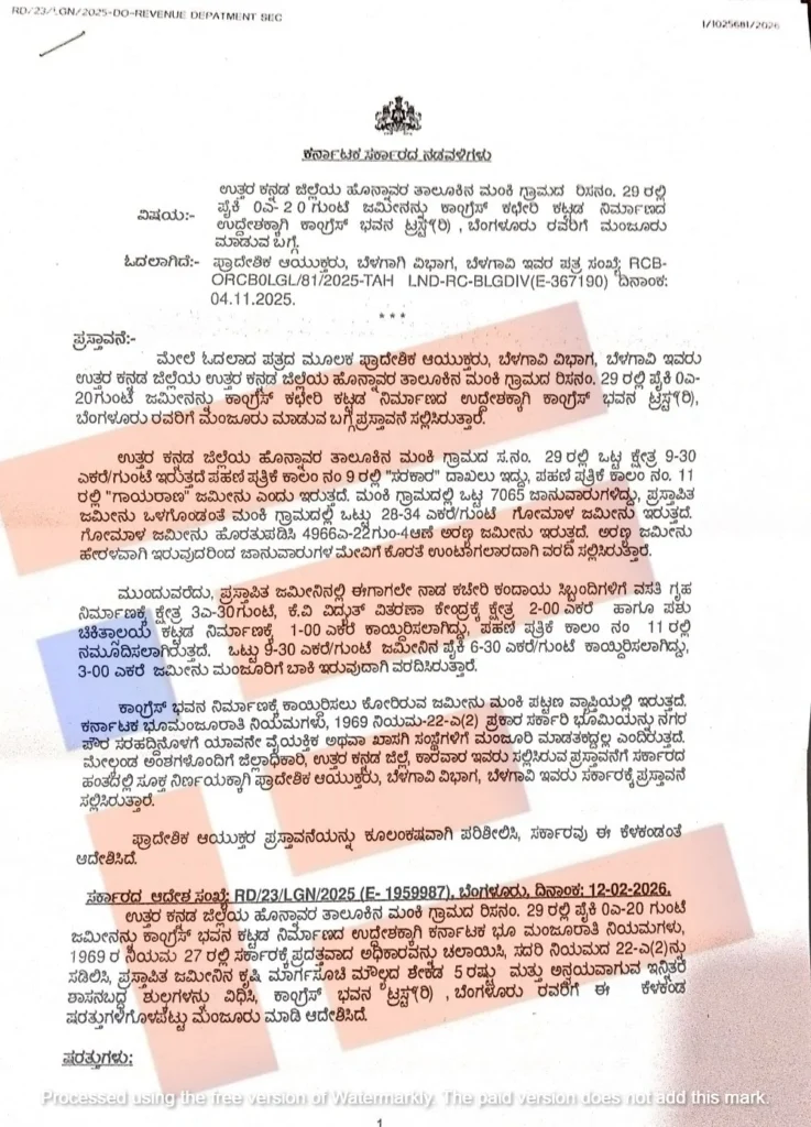 ಉತ್ತರ ಕನ್ನಡ ಜಿಲ್ಲೆಯ ಹೊನ್ನಾವರ ತಾಲೂಕಿನ ಮಂಕಿ ಗ್ರಾಮದಲ್ಲಿ ಕಾಂಗ್ರೆಸ್ ಭವನ ಟ್ರಸ್ಟ್ಗೆ 0.20 ಗುಂಟೆ ವಿಸ್ತೀರ್ಣದ ಗೋಮಾಳ ಜಮೀನನ್ನು ಕಂದಾಯ ಇಲಾಖೆಯು ಮಂಜೂರು ಮಾಡಿದೆ. ಈ ಸಂಬಂಧ ಕಂದಾಯ ಇಲಾಖೆಯು 2026ರ ಫೆ.12ರಂದು ಆದೇಶ ಹೊರಡಿಸಿದೆ. ಈ ಆದೇಶದ ಪ್ರತಿಯು ‘ದಿ ಫೈಲ್’ಗೆ ಲಭ್ಯವಾಗಿದೆ.