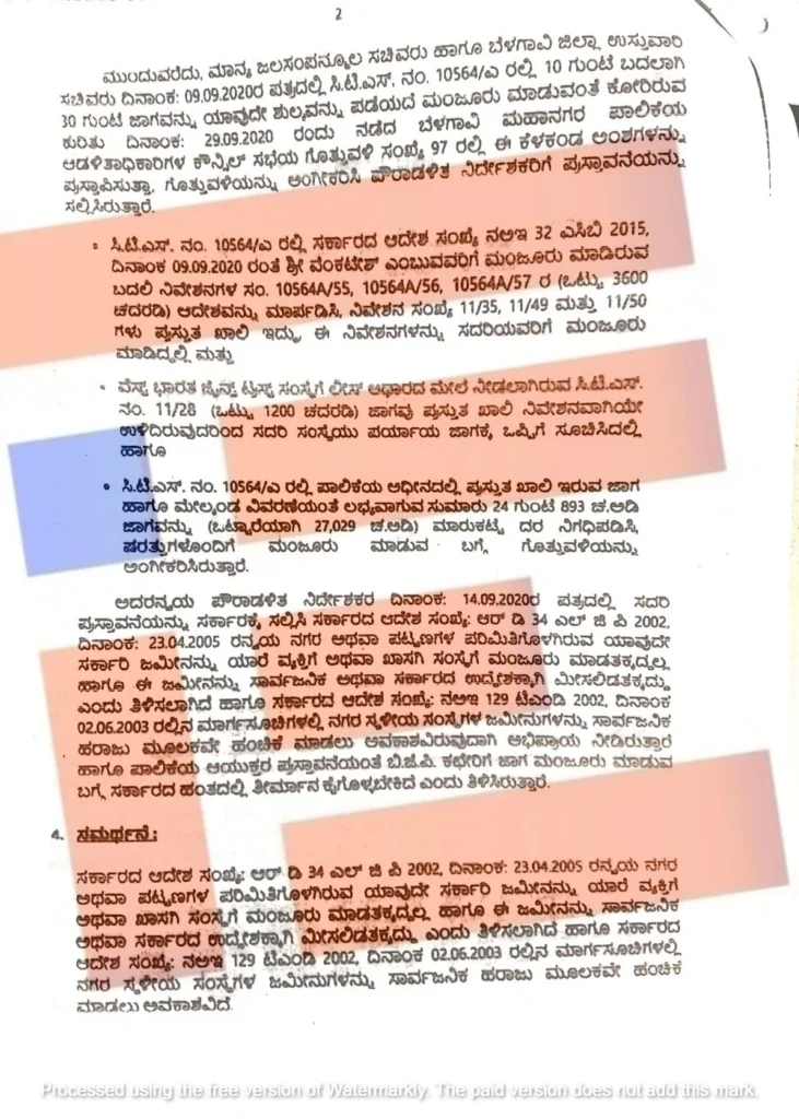 ಬೆಳಗಾವಿ ಗ್ರಾಮಾಂತರ ಜಿಲ್ಲೆಯ ಬಿಜೆಪಿ ಅಧ್ಯಕ್ಷರು ಮತ್ತು ಅಂದಿನ ಜಿಲ್ಲಾ ಉಸ್ತುವಾರಿ ಸಚಿವರು ಕೋರಿದ್ದ (ಸಿಟಿಎಸ್ ನಂ 10564/ಎ ) ಜಾಗವು ಆಗಲೇ ಇಬ್ಬರು ಖಾಸಗಿ ವ್ಯಕ್ತಿ, ಸಂಸ್ಥೆಗೆ ಮಂಜೂರಾಗಿತ್ತು. ವೆಂಕಟೇಶ್ ಎಂಬುವರಿಗೆ ಮಂಜೂರು ಮಾಡಿರುವ ಬದಲಿ ನಿವೇಶನ (ಸಂಖ್ಯೆ 10564ಎ/55, 105641ಎ/56, 10564ಎ/57ರಲ್ಲಿದ್ದ ಒಟ್ಟು 3,600 ಚದರಡಿ ಮಂಜೂರಾಗಿತ್ತು. ಈ ಆದೇಶವನ್ನು ಮಾರ್ಪಡಿಸಿ ನಿವೇಶನ ಸಂಖ್ಯೆ 11/35, 11/49, 11/50ಗಳು ಪ್ರಸ್ತುತ ಖಾಲಿ ಇವೆ. ಈ ನಿವೇಶನಗಳನ್ನು ವೆಂಕಟೇಶ್ ಎಂಬುವರಿಗೆ ಮಂಜೂರು ಮಾಡಬೇಕು ಎಂದು ಪೌರಾಡಳಿತ ನಿರ್ದೇಶಕರಿಗೆ ಪ್ರಸ್ತಾವ ಸಲ್ಲಿಕೆಯಾಗಿತ್ತು.