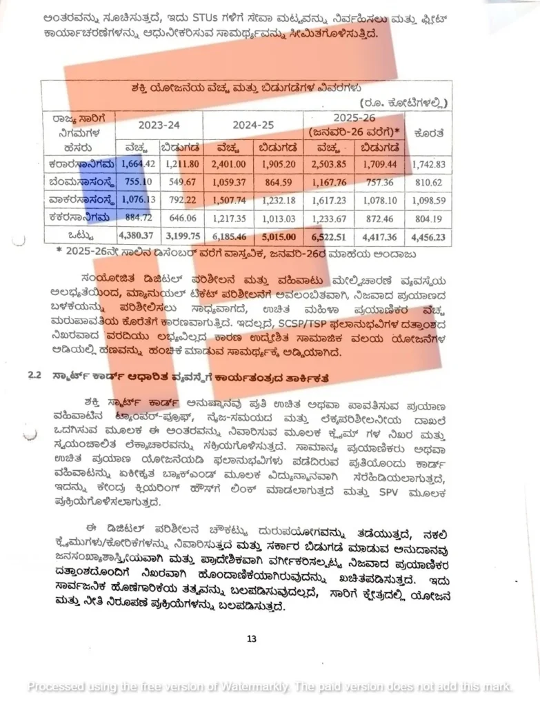 ನಾಲ್ಕು ಸಾರಿಗೆ ನಿಗಮಗಳಲ್ಲಿ ಶಕ್ತಿ ಯೋಜನೆಯಡಿ ನಿಜವಾದ ಪ್ರಯಾಣ ಬಳಕೆ ಪರಿಶೀಲಿಸಲು ಸಾಧ್ಯವಾಗುತ್ತಿಲ್ಲ ಎಂದು ಸಾರಿಗೆ ಇಲಾಖೆಯು ಹೇಳಿದೆ. ಸಂಯೋಜಿತ ಡಿಜಿಟಲ್ ಪರಿಶೀಲನೆ, ವಹಿವಾಟು ವ್ಯವಸ್ಥೆಯು ಇಲ್ಲವಾಗಿದೆ. ಮ್ಯಾನುಯಲ್ ಟಿಕೆಟ್ ಪರಿಶೀಲನೆ ಮೇಲೆಯೇ ನಿಗಮಗಳು ಅವಲಂಬಿತವಾಗಿವೆ. ಹೀಗಾಗಿ ನಿಜವಾದ ಪ್ರಯಾಣದ ಬಳಕೆ ಪರಿಶೀಲಿಸಲು ಸಾಧ್ಯವಾಗುತ್ತಿಲ್ಲ. ಹೀಗಾಗಿ ಉಚಿತ ಮಹಿಳಾ ಪ್ರಯಾಣಿಕರ ವೆಚ್ಚ ಮರುಪಾವತಿಯ ಕೊರತೆಗೆ ಕಾರಣವಾಗುತ್ತಿದೆ ಎಂದು ಇಲಾಖೆಯು ವಿವರಿಸಿರುವುದು ಟಿಪ್ಪಣಿ ಹಾಳೆಯಿಂದ ತಿಳಿದು ಬಂದಿದೆ.