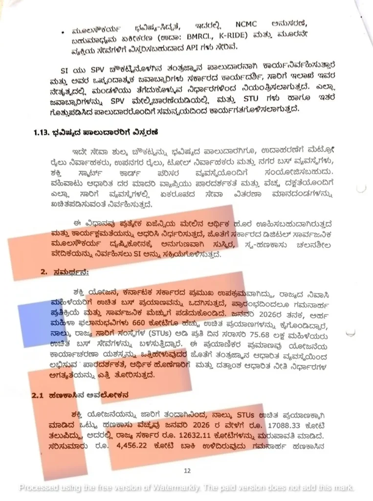 ಶಕ್ತಿ ಯೋಜನೆಯ ಅರ್ಹ ಮಹಿಳಾ ಪ್ರಯಾಣಿಕರಿಗೆ ಸ್ಮಾರ್ಟ್ ಕಾರ್ಡ್ ನೀಡುವ ಸಂಬಂಧ ಸಾರಿಗೆ ಇಲಾಖೆಯು ಸಚಿವ ಸಂಪುಟಕ್ಕೆ ಒದಗಿಸಿರುವ ವಿವರಣೆಯಲ್ಲಿ ಈ ಮಾಹಿತಿ ಇದೆ. ಸಚಿವ ಸಂಪುಟಕ್ಕೆ ಸಲ್ಲಿಸಿರುವ ಕಡತದ ಹಾಳೆಗಳು ‘ದಿ ಫೈಲ್’ಗೆ ಲಭ್ಯವಾಗಿವೆ.